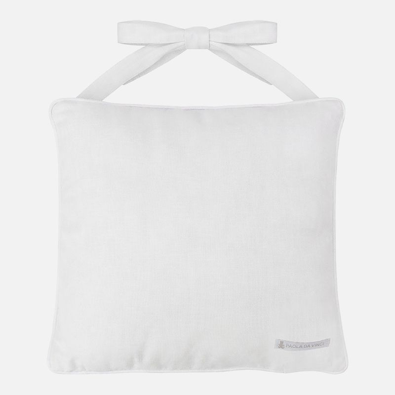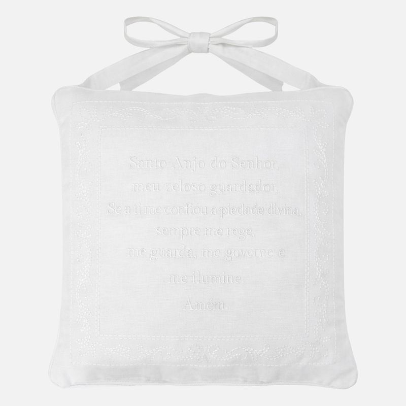 Almofada bebê em linho branco, delicada e atemporal, criada para transmitir proteção, fé e aconchego ao enxoval. Confeccionada em tecido linen fresh, de toque suave e fresco, apresenta bordado delicado com a oração do Santo Anjo, trazendo um significado especial e afetuoso para o quarto do bebê. O acabamento refinado, com laço para pendurar, revela o cuidado artesanal e o charme clássico da peça.