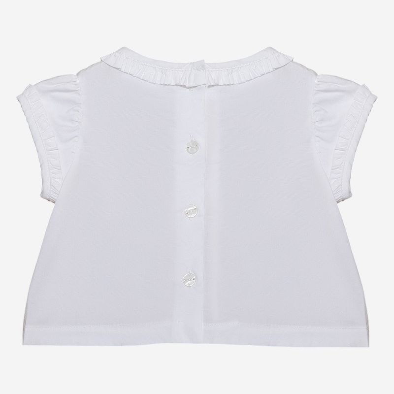 Seu design clássico apresenta mangas curtas com delicados babadinhos, gola com detalhe franzido e amarração em fita, que confere charme e acabamento refinado.