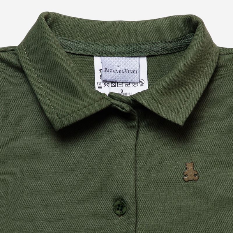 O modelo em tom verde apresenta gola polo clássica, abotoamento frontal e bordado que adiciona charme e autenticidade à peça.