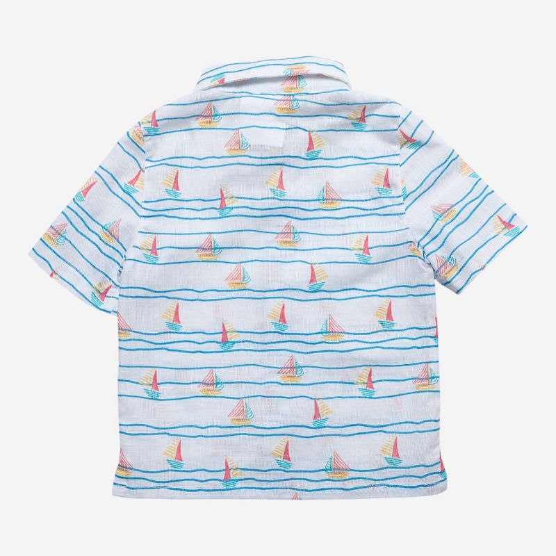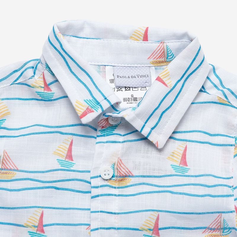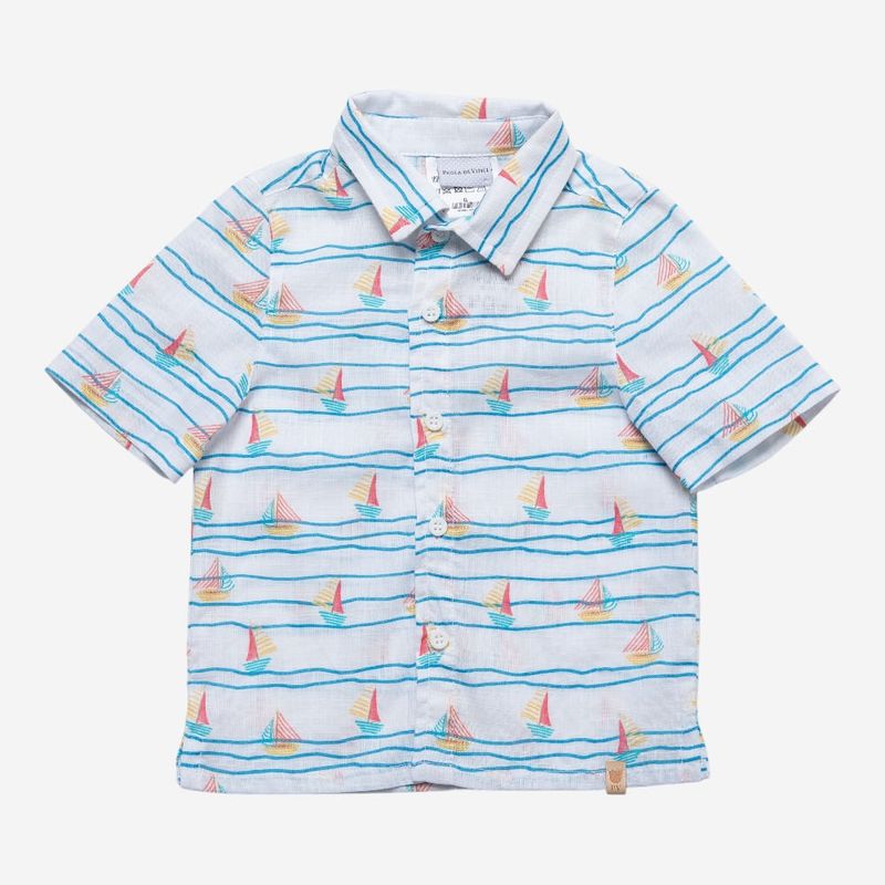 A estampa exclusiva de barquinhos coloridos sobre listras em azul remete ao universo náutico de forma delicada e divertida. O modelo possui gola clássica, mangas curtas e fechamento por botões frontais, garantindo praticidade no vestir e acabamento refinado.
