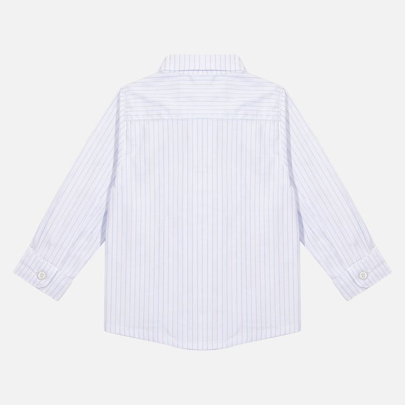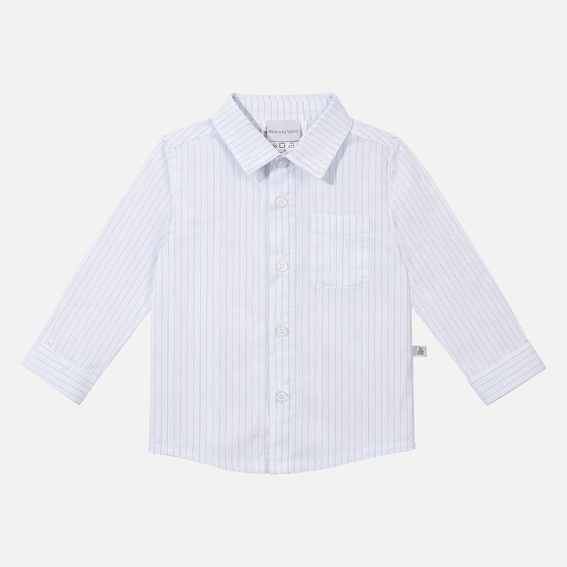 Camisa bebê, em tecido leve de algodão, na cor branca com listras azuis, é perfeita para ocasiões especiais e para o dia a dia com elegância. O algodão macio e respirável garante conforto absoluto, respeitando a pele sensível do bebê, enquanto a estampa listrada clássica traz um visual atemporal e delicado.