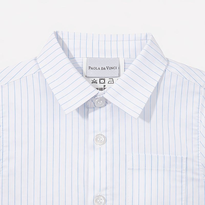 Manga longa, fechamento por botões e bolso frontal complementam o design funcional e sofisticado. A camisa listrada azul oferece ótimo caimento e liberdade de movimento, traduzindo o cuidado, a qualidade e o estilo acolhedor característicos da Paola da Vinci.