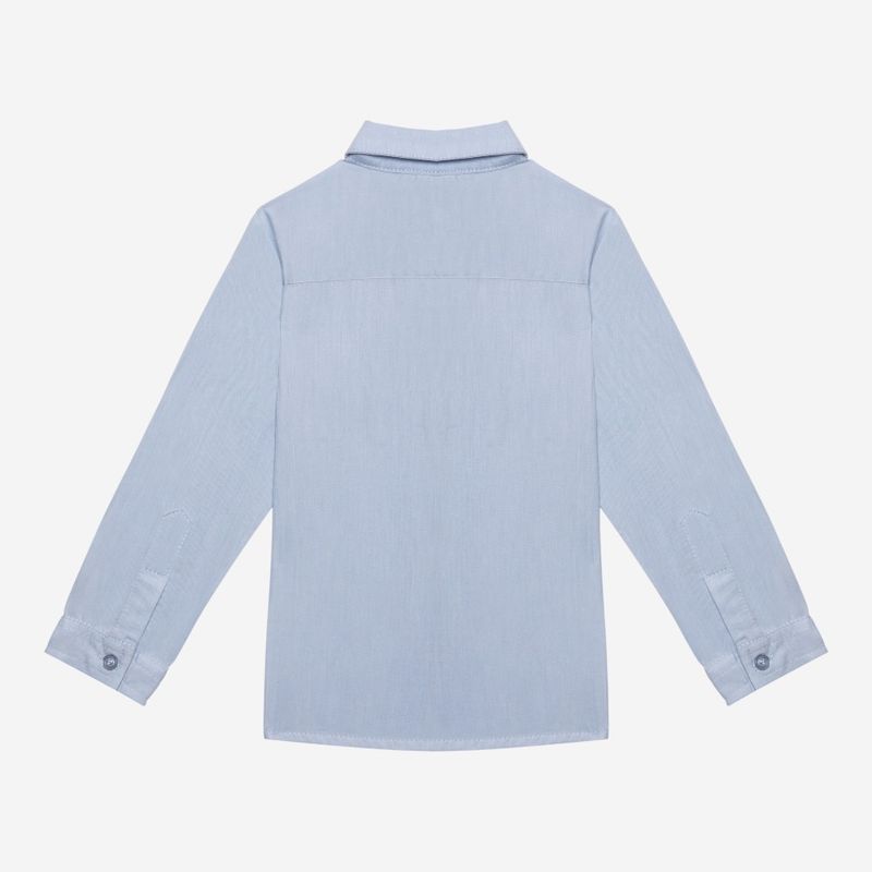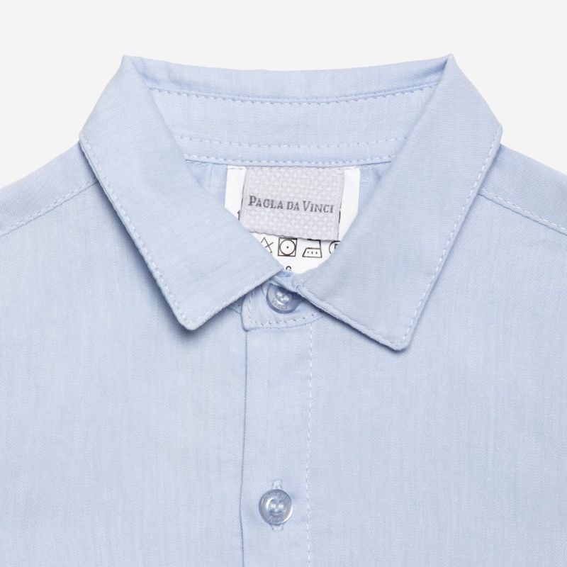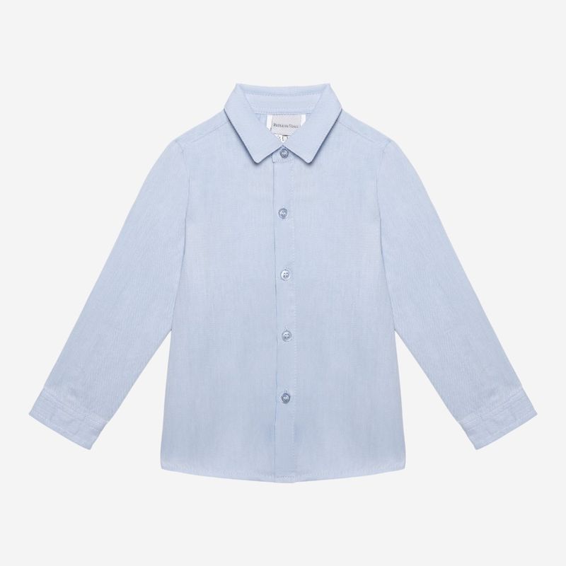 O modelo apresenta gola tradicional, abertura frontal com botões e punhos ajustáveis, garantindo caimento impecável e acabamento refinado. O tom azul bebê confere delicadeza e sofisticação, ideal para compor produções elegantes e atemporais.