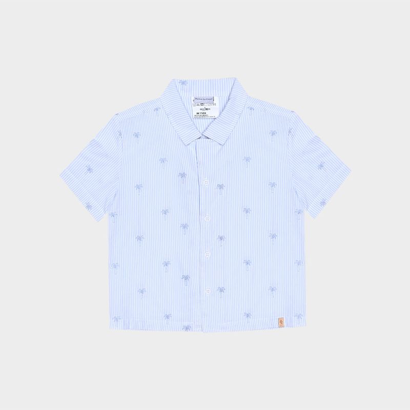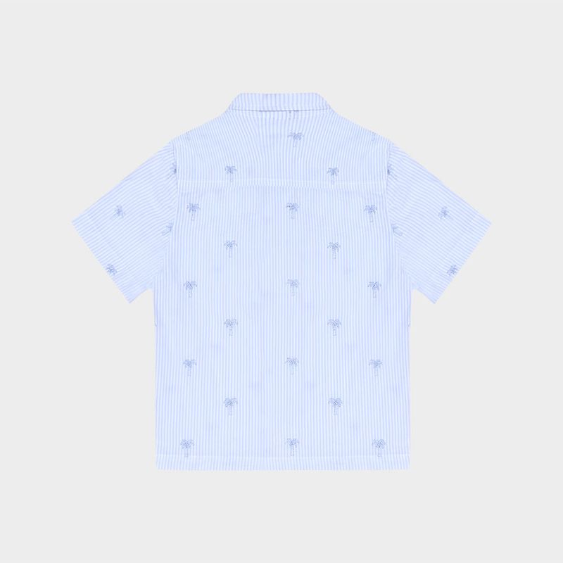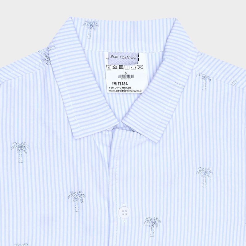 O design clássico de manga curta e gola esporte recebe um toque especial com a padronagem listrada em azul claro e branco, enriquecida por bordados delicados de coqueiros, que trazem charme lúdico e atemporal. O fechamento frontal por botões complementa a peça com praticidade e elegância.