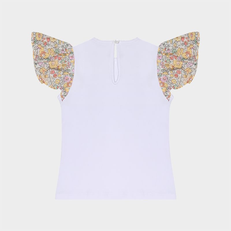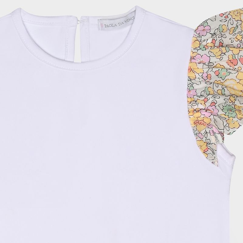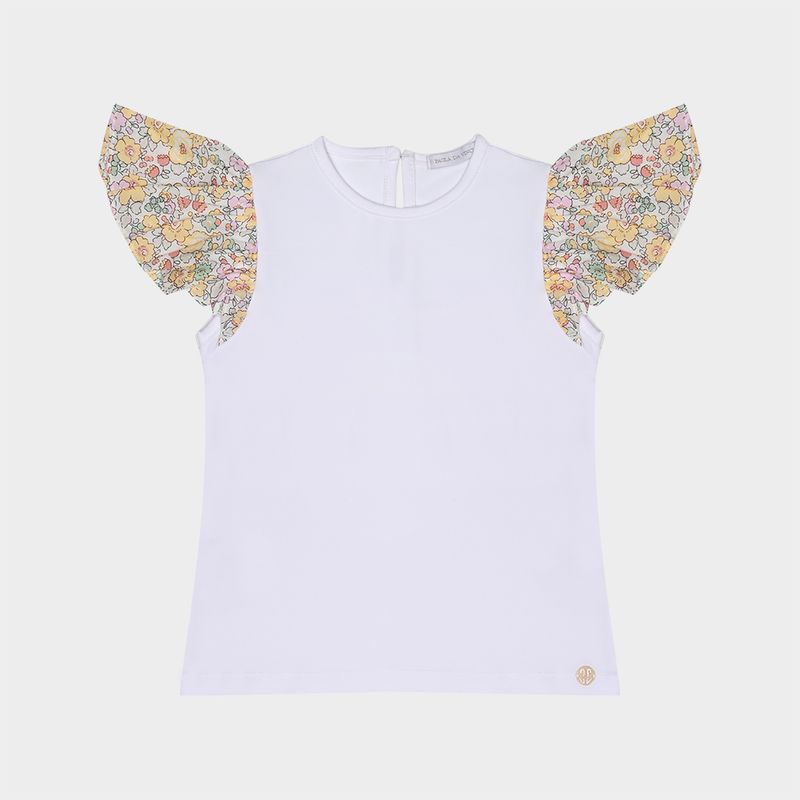O modelo possui acabamento delicado na gola e fechamento com botão nas costas, tornando o vestir mais prático e charmoso. Perfeita para compor looks leves e elegantes, a camiseta branca com mangas florais é ideal para momentos especiais ou para o dia a dia, mantendo o estilo clássico e acolhedor característico da Paola da Vinci.