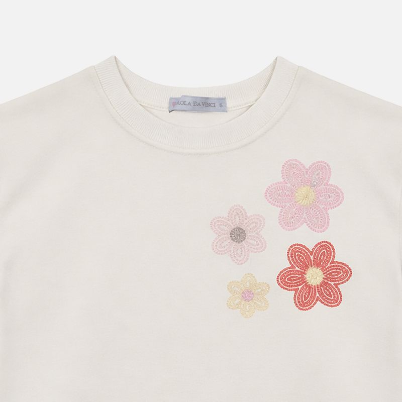 Manga curta, gola careca e modelagem confortável garantem liberdade de movimento e um caimento delicado. A camiseta infantil com bordado floral é perfeita para composições leves, refletindo o cuidado e a elegância característicos da Paola da Vinci.