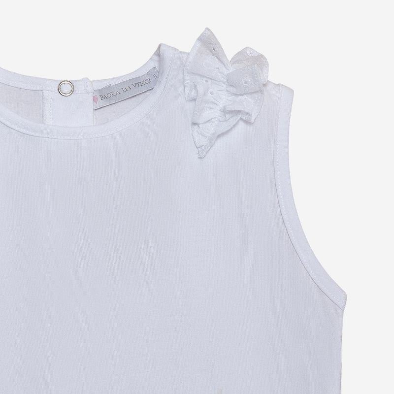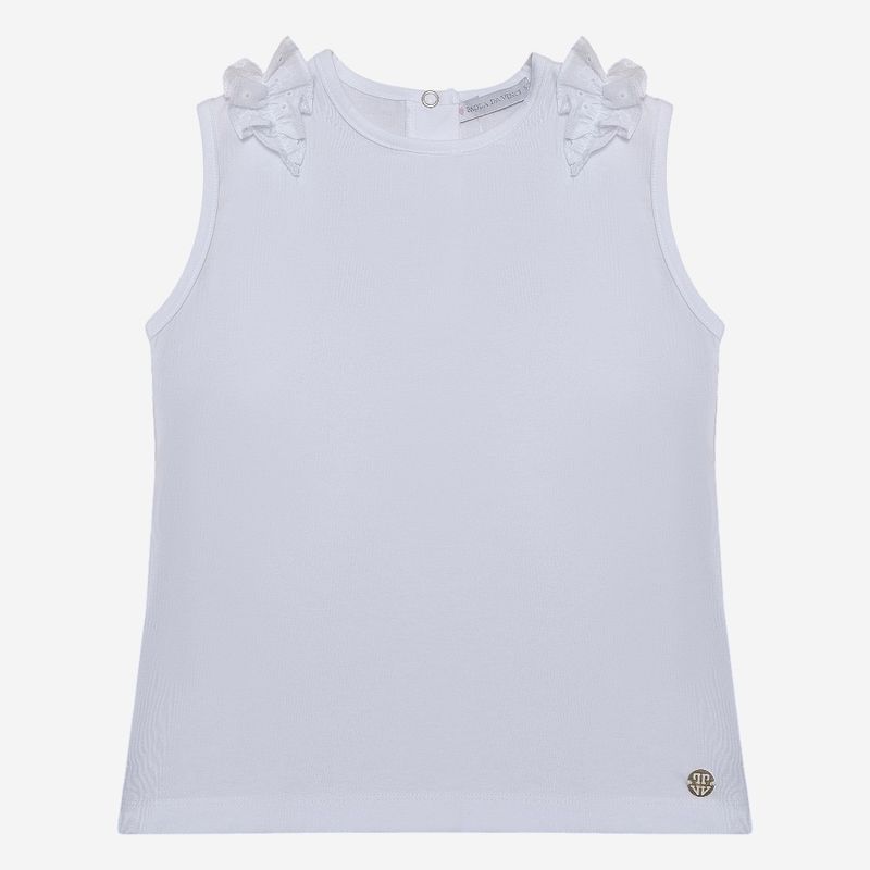 O destaque fica por conta dos babados nos ombros com aplicação de bordado inglês, que conferem um charme romântico e refinado à peça.
