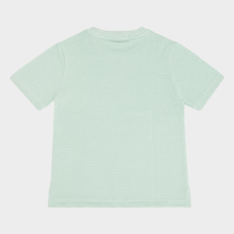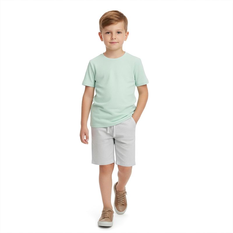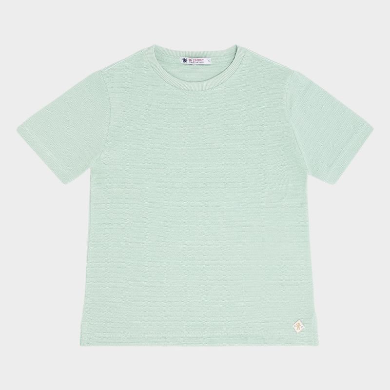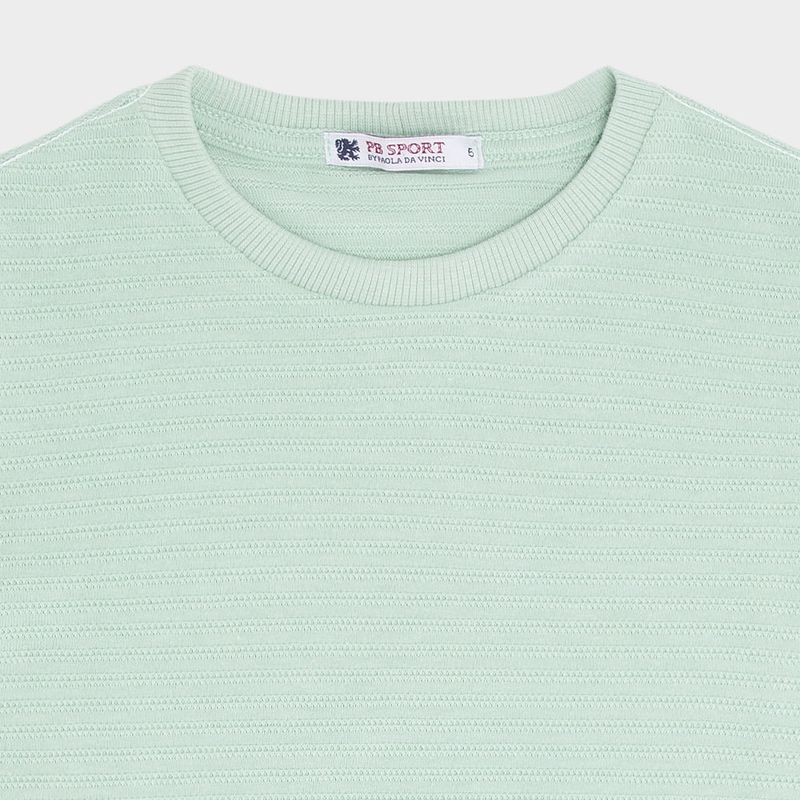 O modelo possui gola redonda com acabamento canelado e mangas curtas, proporcionando conforto e liberdade nos movimentos. O tom de verde claro é suave e versátil, ideal para composições casuais elegantes.