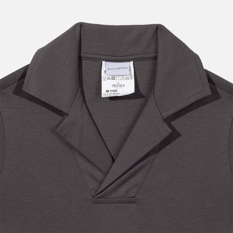 Gola polo sem botões, manga curta e modelagem confortável trazem um design moderno e elegante, ideal para produções casuais mais alinhadas. A camiseta polo infantil chumbo é versátil, fácil de combinar e traduz o cuidado, a qualidade e o acabamento refinado característicos da Paola da Vinci.