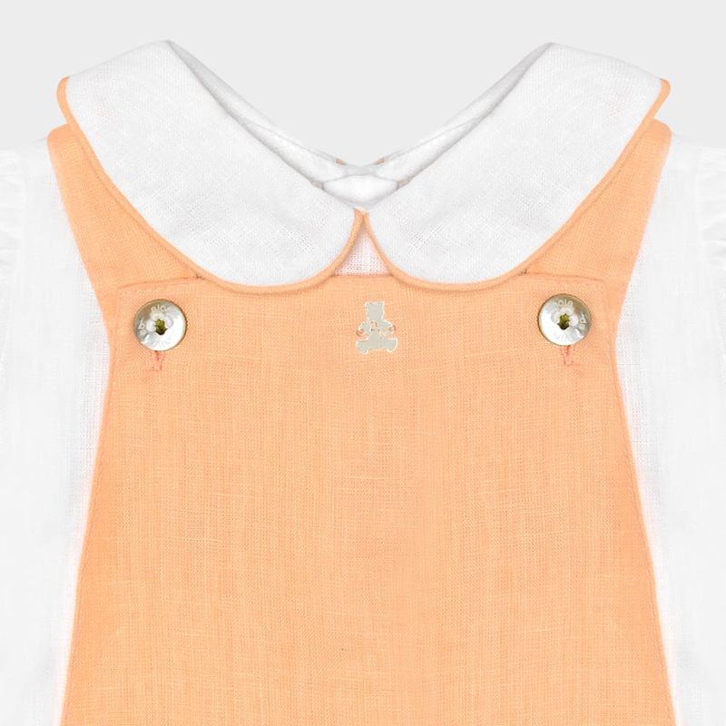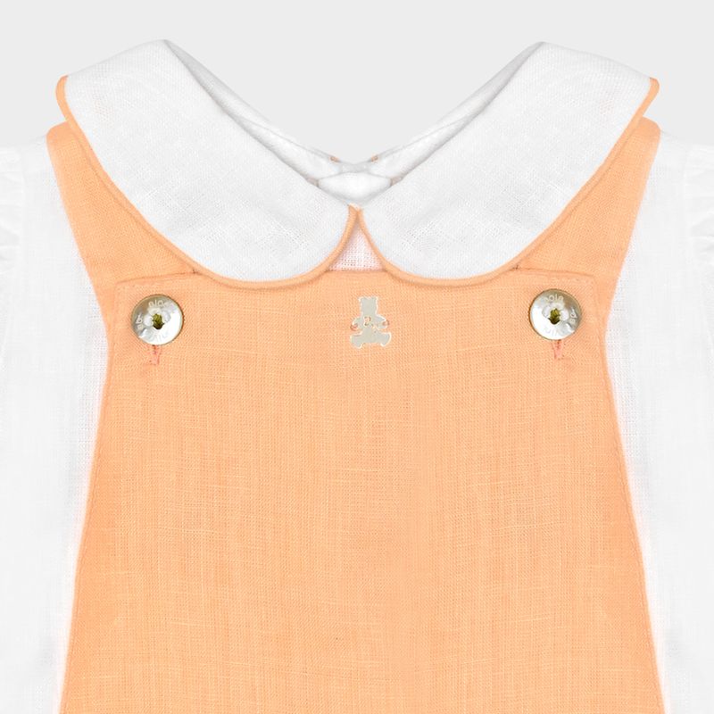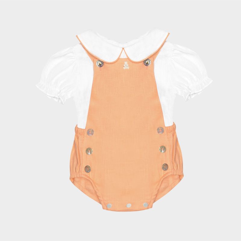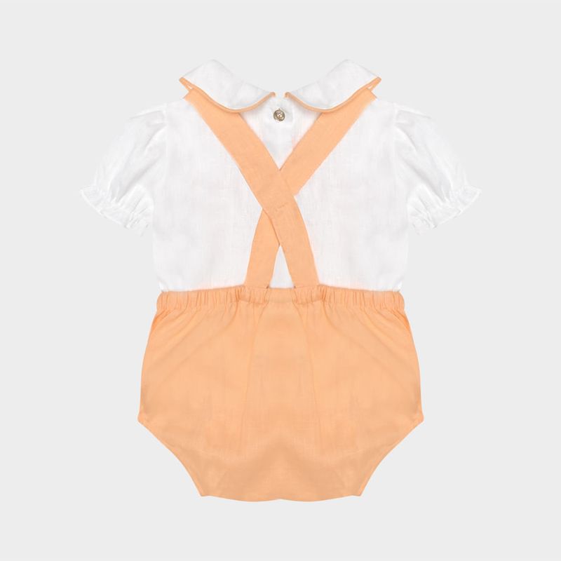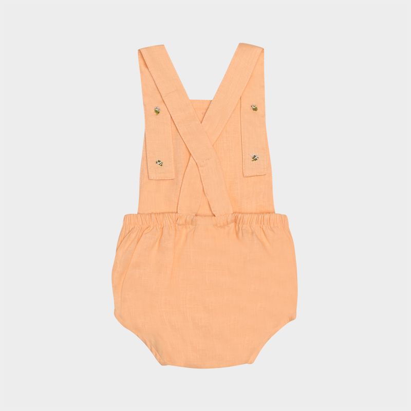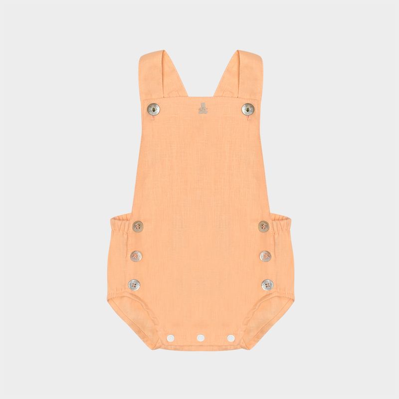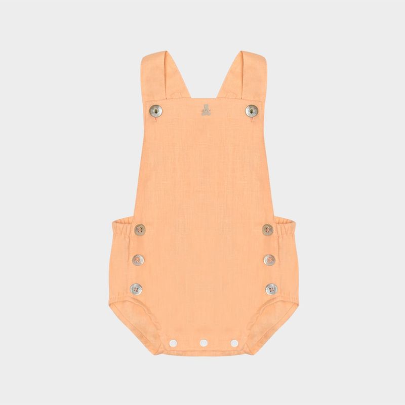 A jardineira em tom pêssego suave apresenta botões em madrepérola, alças cruzadas nas costas e abertura inferior com botões de pressão, que facilita a troca do bebê com conforto e elegância.