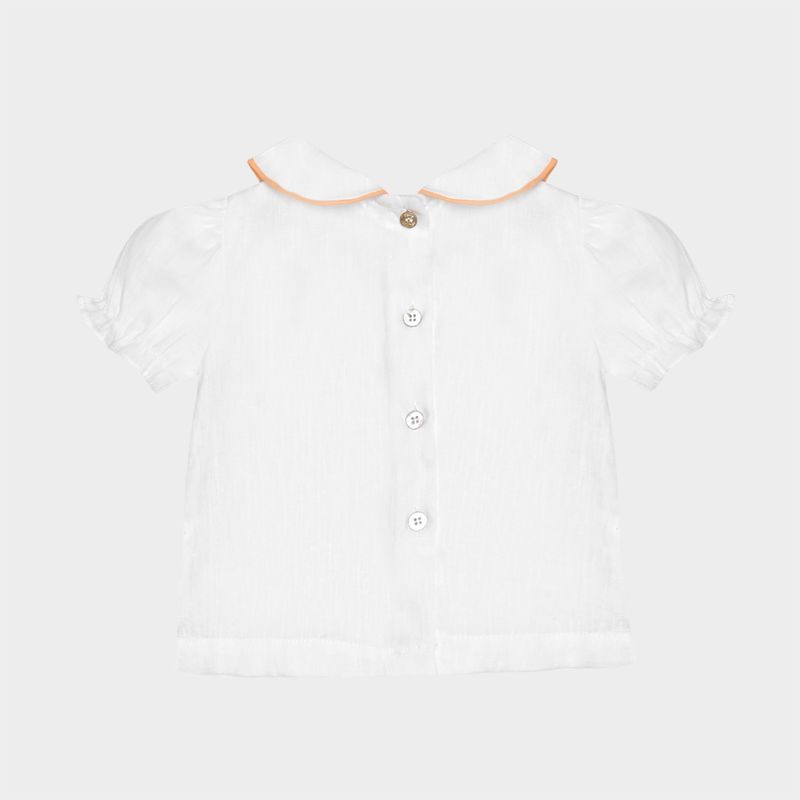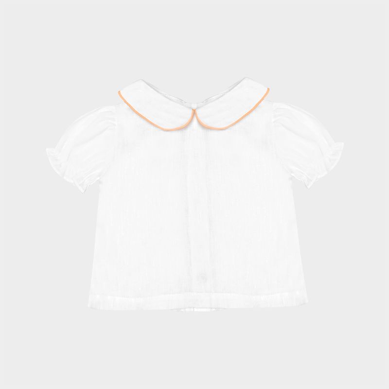 A camisa branca com gola peter pan traz acabamento delicado com vivo contrastante, mangas bufantes e abotoamento posterior, garantindo praticidade ao vestir.