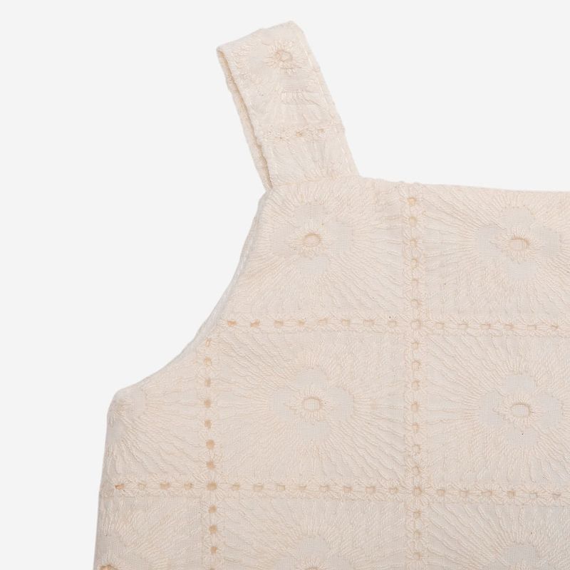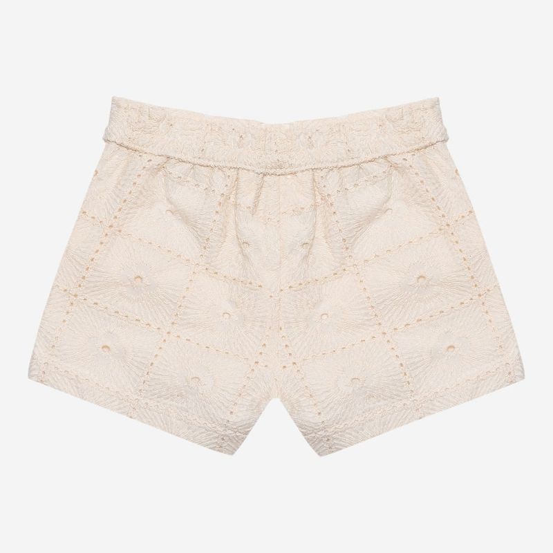 O short acompanha a mesma padronagem bordada em algodão, com cós elástico que garante ajuste confortável sem limitar os movimentos. O bordado delicado em formato floral cria um efeito sofisticado e artesanal, ideal para compor produções refinadas.