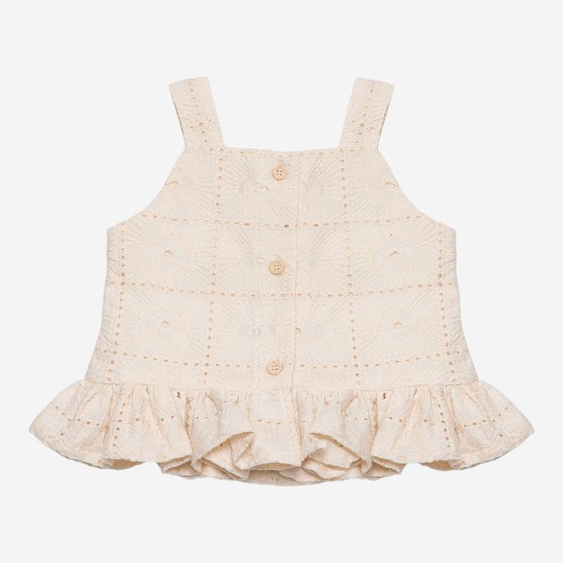 O Conjunto Bordado Manzoni foi criado para expressar charme e delicadeza. A blusa de alças finas possui caimento fluido e babado na barra, que garante movimento e graciosidade. O fechamento posterior por botões facilita o vestir com praticidade e completa o acabamento elegante.