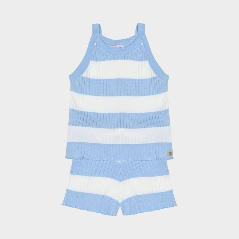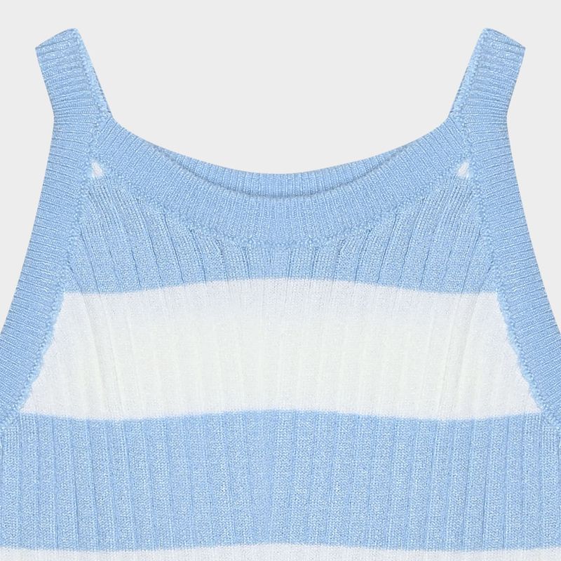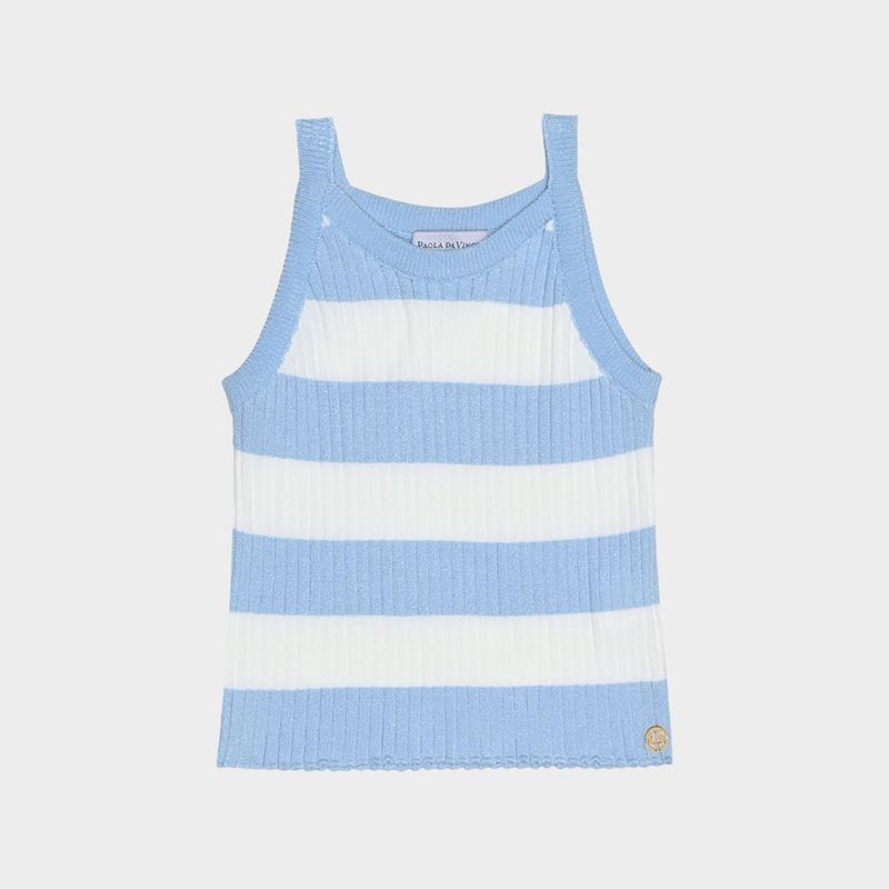 A blusa de alças finas apresenta modelagem reta e moderna, valorizada pelas listras horizontais em azul e branco, que trazem frescor e charme atemporal.