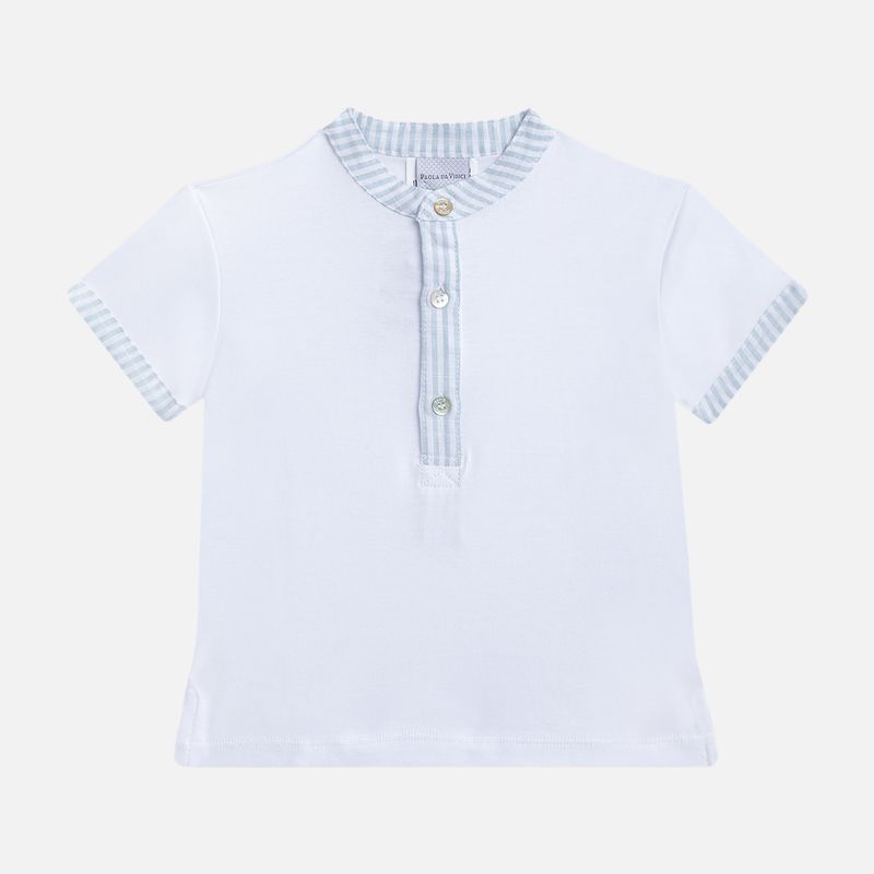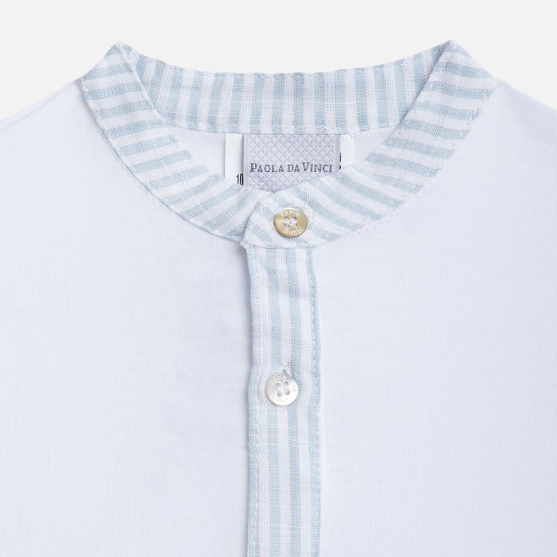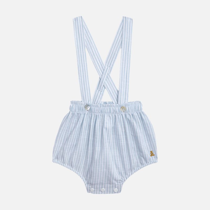 Acompanha camisa em algodão egípcio premium, com gola padre e abotoamento frontal, trazendo o contraste delicado das listras azul-claro nos acabamentos da gola e das mangas. O bloomer em tricoline listrada, com alças cruzadas nas costas e elástico na cintura e pernas, oferece ajuste perfeito e conforto para os movimentos do bebê. Detalhes como os botões perolados.