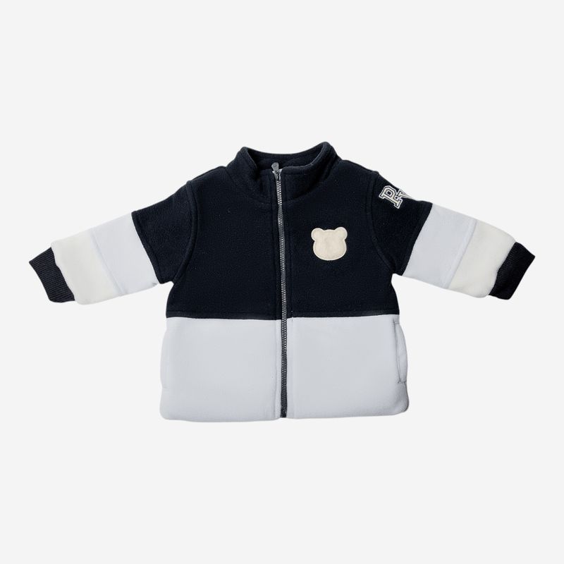 A jaqueta possui modelagem confortável com gola alta e fechamento frontal por zíper, ideal para proteger o bebê com praticidade. Os recortes horizontais trazem um visual moderno e esportivo. Destaque para o patch de ursinho aplicado no peito e o bordado na manga, que reforçam o DNA lúdico e sofisticado da marca. Os punhos canelados finalizam com um toque funcional e delicado.