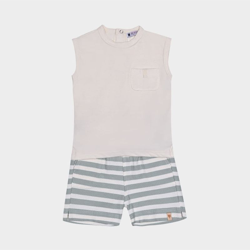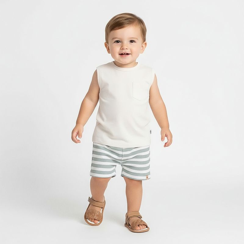 A bermuda, em malha listrada verde e off white, possui cós elástico com amarração funcional e bolso embutido, garantindo liberdade de movimento e praticidade.