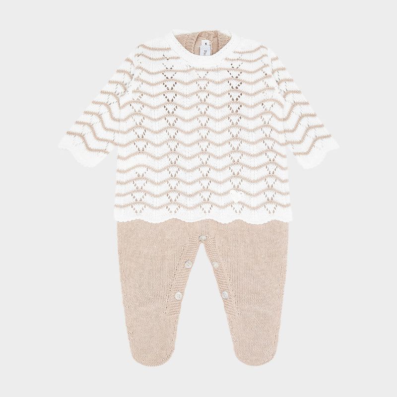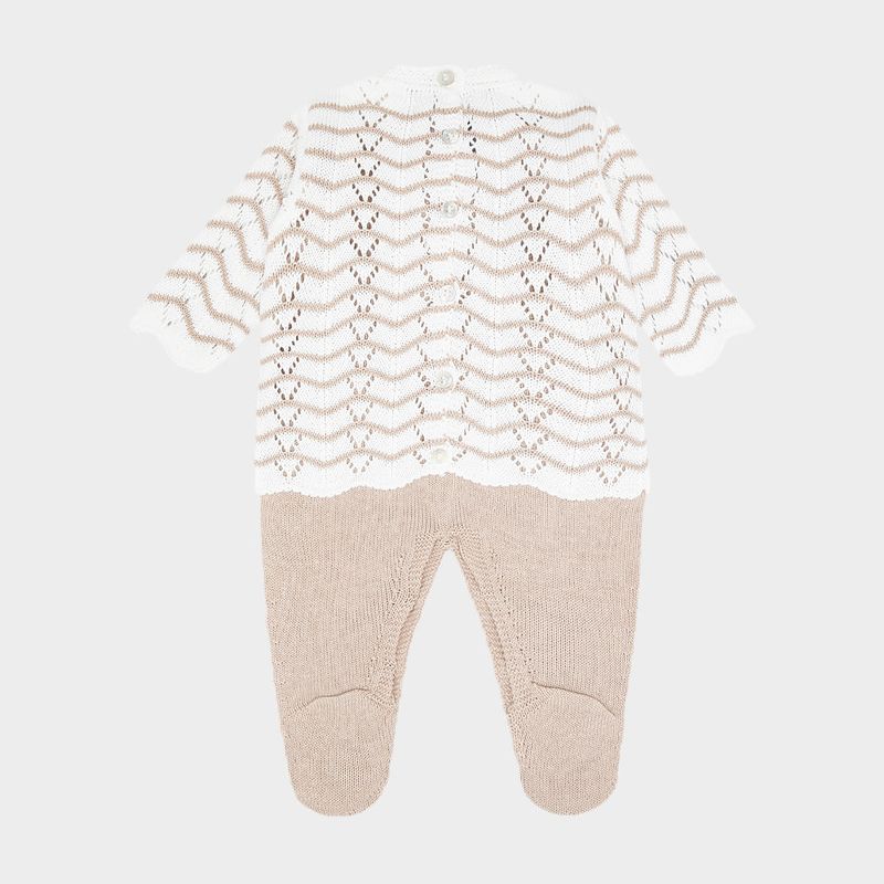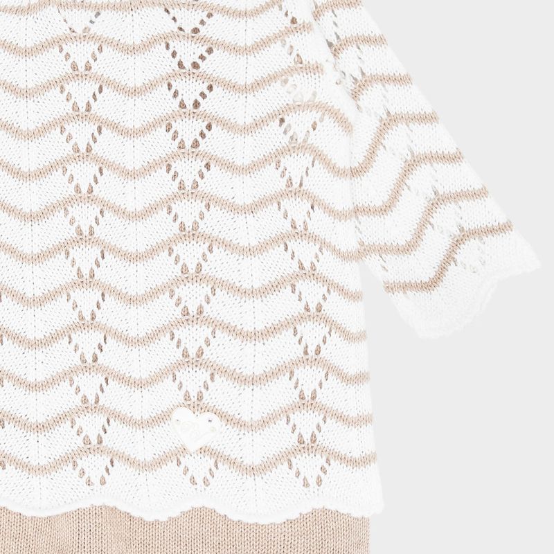 Este encantador conjunto é confeccionado em tricot com composição de 50% algodão e 50% acrílico, proporcionando conforto térmico e toque macio ideal para a pele delicada do bebê.