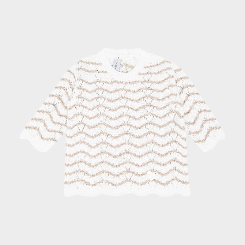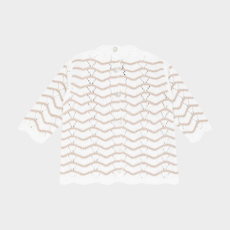 O casaco, todo trabalhado com pontos que remetem ao crochê artesanal, traz um delicado padrão de ondas por toda a peça. Possui mangas longas e abertura nas costas com botões funcionais, facilitando o momento de vestir. O acabamento ondulado nas mangas e na barra reforça o charme e a delicadeza do design.