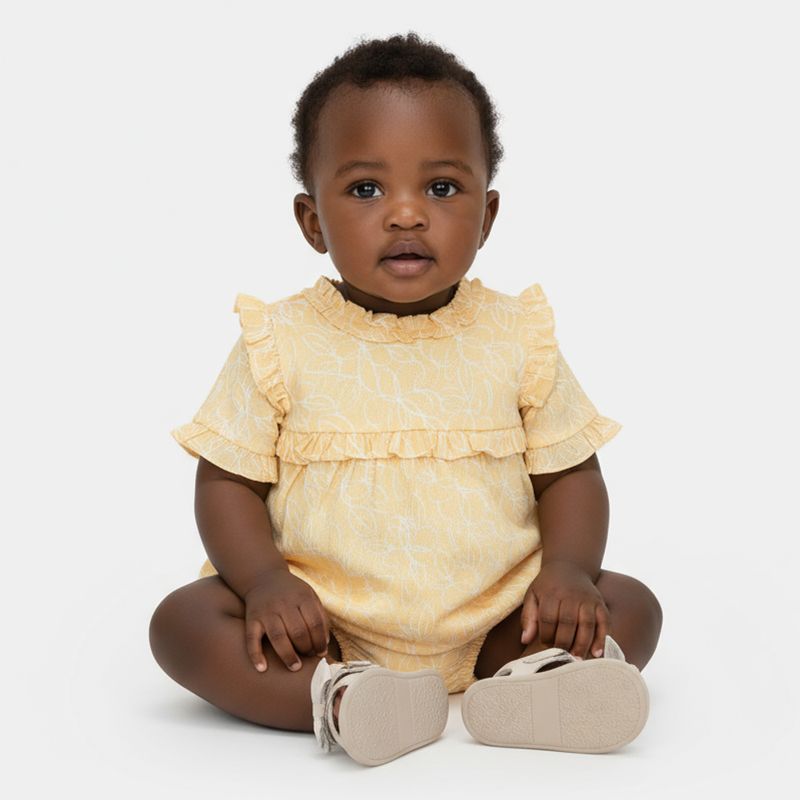 O conjunto de bebê feminino oferece em duas peças um look prático e completo para o dia a dia do bebê. Apresenta uma delicada batinha que leva um caimento soltinho, babados presentes no acabamento, além do shorts com elásticos dispostos que oferecem um ajuste eficaz. A estampa criar em conjunto com os botões na mesma tonalidade, dão à peça um acabamento minucioso.