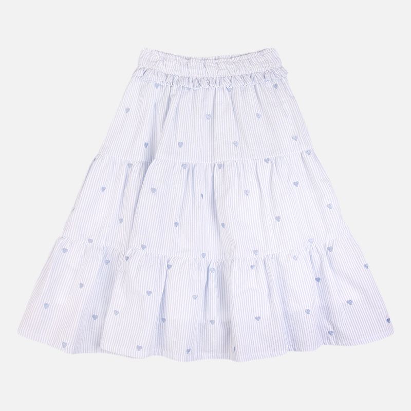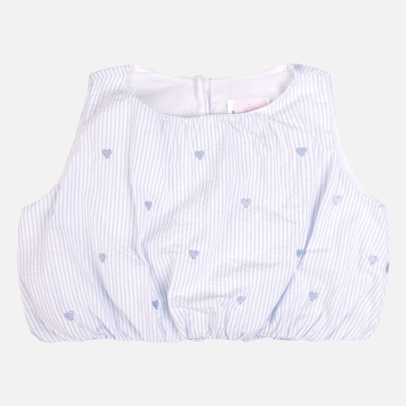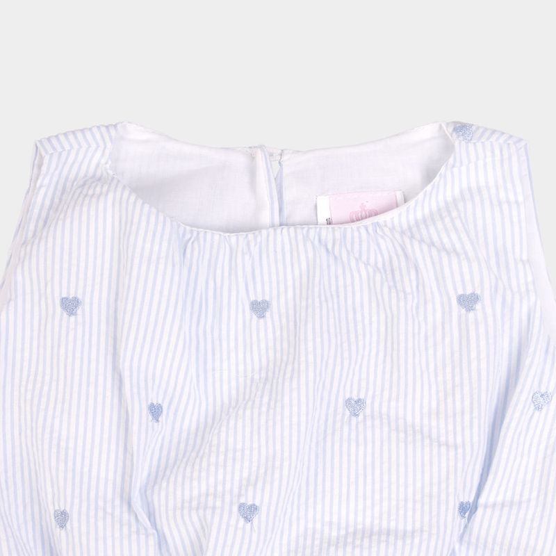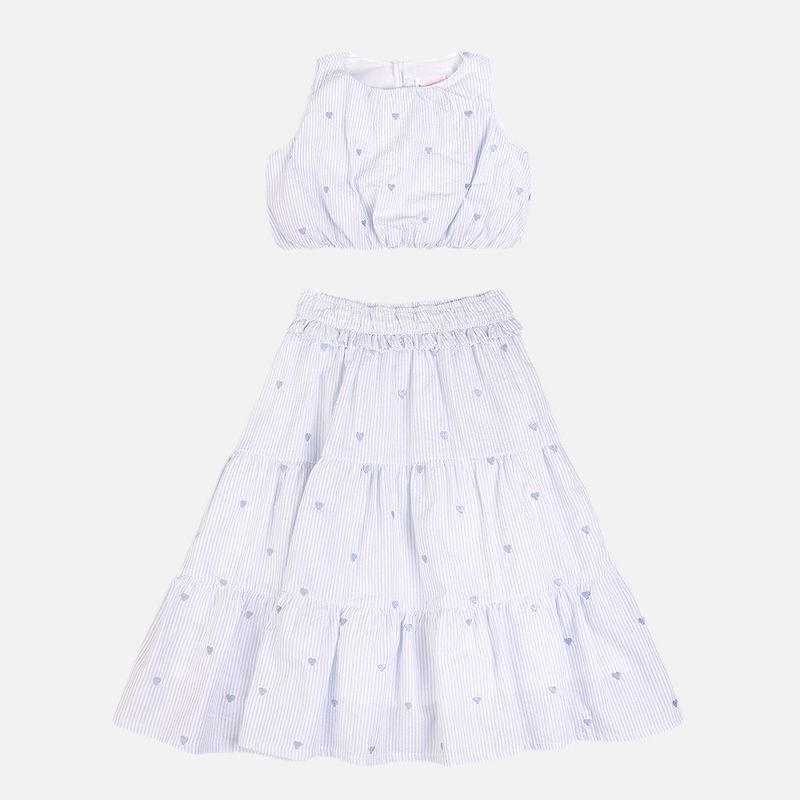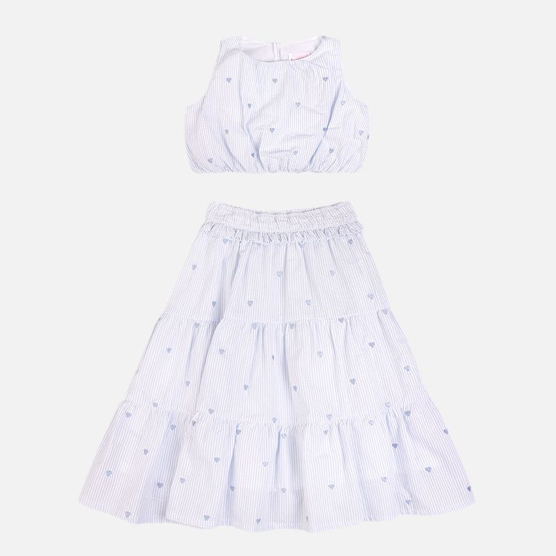 Conjunto Infantil Anarruga Saia Bordado Coração Azul é confeccionado em tecido 100% algodão, garantindo leveza, frescor e muito conforto para acompanhar a rotina da criança. A padronagem listrada combinada ao delicado bordado de corações azuis traz um visual suave e encantador, enquanto o top com caimento soltinho oferece conforto e liberdade de movimentos.