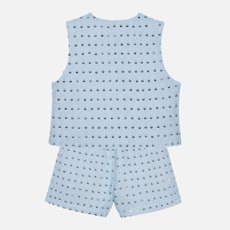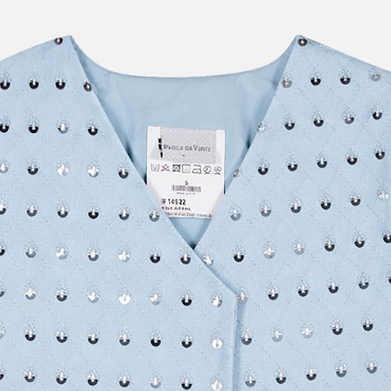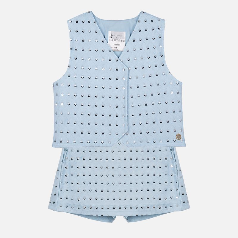 Conjunto infantil em linho com bordado paetê confeccionado em tecido leve e sofisticado, que combina linho, viscose, algodão e poliéster, garantindo conforto, frescor e delicadeza para a pele do bebê. Na cor azul, o visual se destaca pelo bordado com paetês sutis, que trazem brilho elegante e um toque especial, ideal para ocasiões especiais com charme e suavidade.