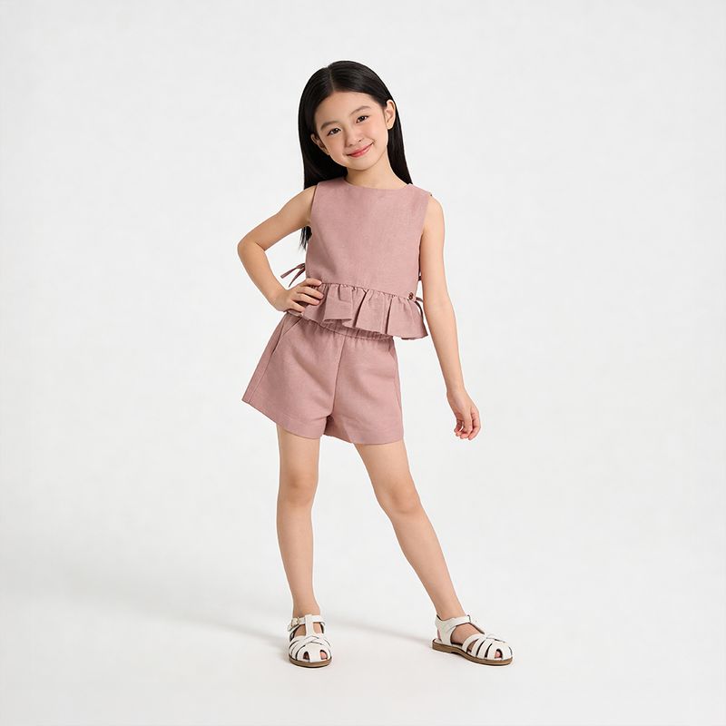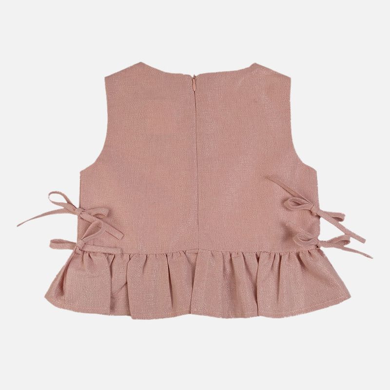 Conjunto Infantil Lurex com Laços Rosa é confeccionado em tecido com 51% algodão e 44% viscose, um material leve, macio e com toque confortável para a pele delicada da criança. Seu brilho sutil, proporcionado pelo efeito de lurex, adiciona elegância ao visual, enquanto os laços laterais e o babado na barra da blusa trazem um charme especial ao conjunto.