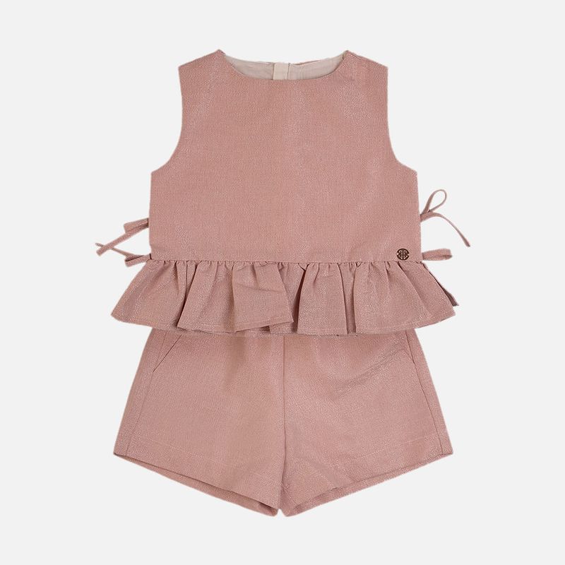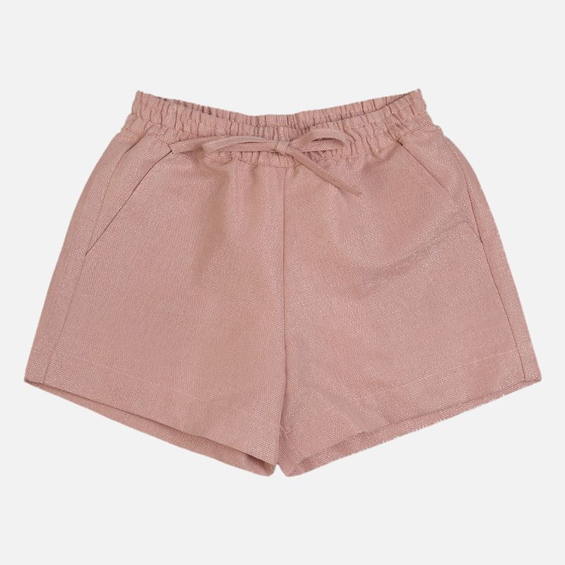 O shorts rosa com lurex complementa o look com praticidade, oferecendo cós elástico e ajuste por amarração, garantindo liberdade de movimentos e bem-estar ao longo do dia. Um conjunto delicado e sofisticado, perfeito para ocasiões especiais ou para dar um toque encantador ao cotidiano.