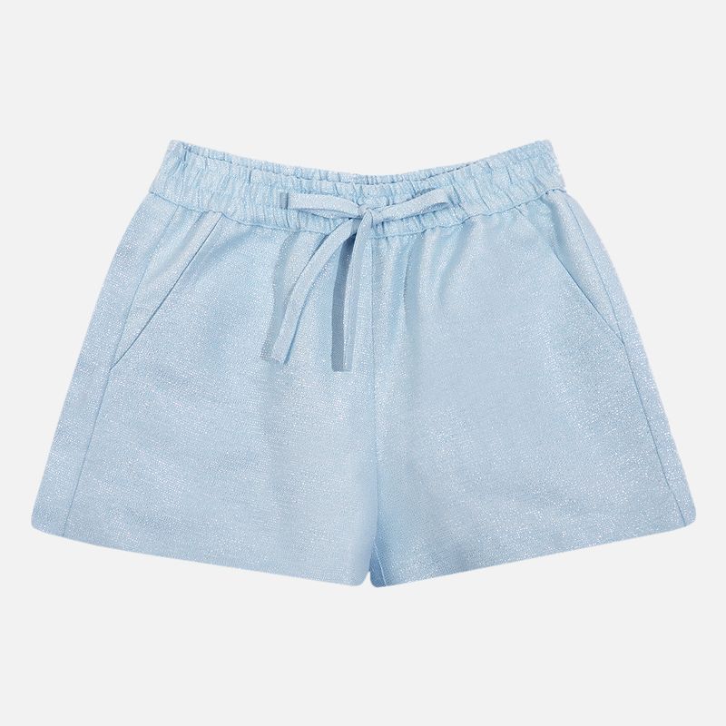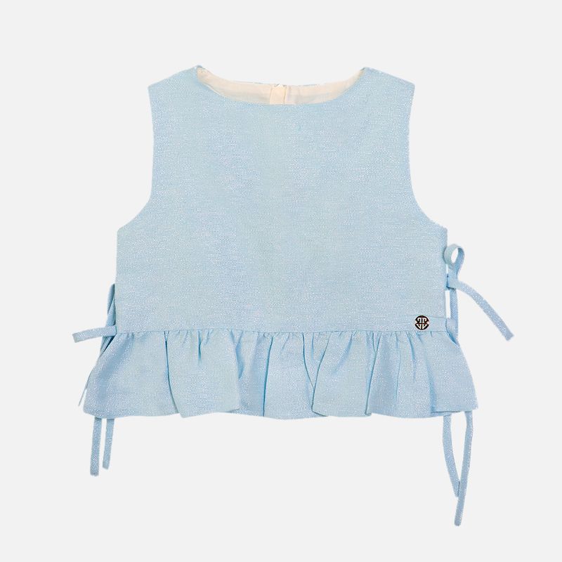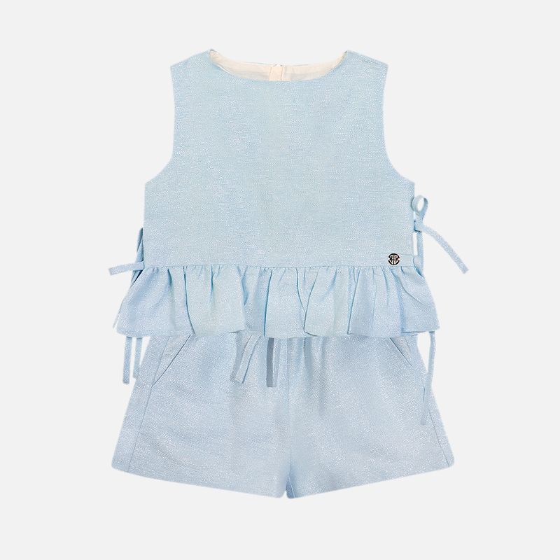 A blusa sem mangas possui babado delicado na barra e lacinhos laterais, que adicionam romantismo e um caimento gracioso ao design. O fechamento traseiro com zíper garante praticidade ao vestir. O shorts em lurex completa o look com cós elástico confortável, laço frontal e caimento leve, oferecendo liberdade de movimento e bem-estar para a pequena.