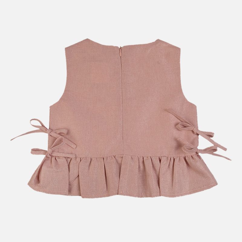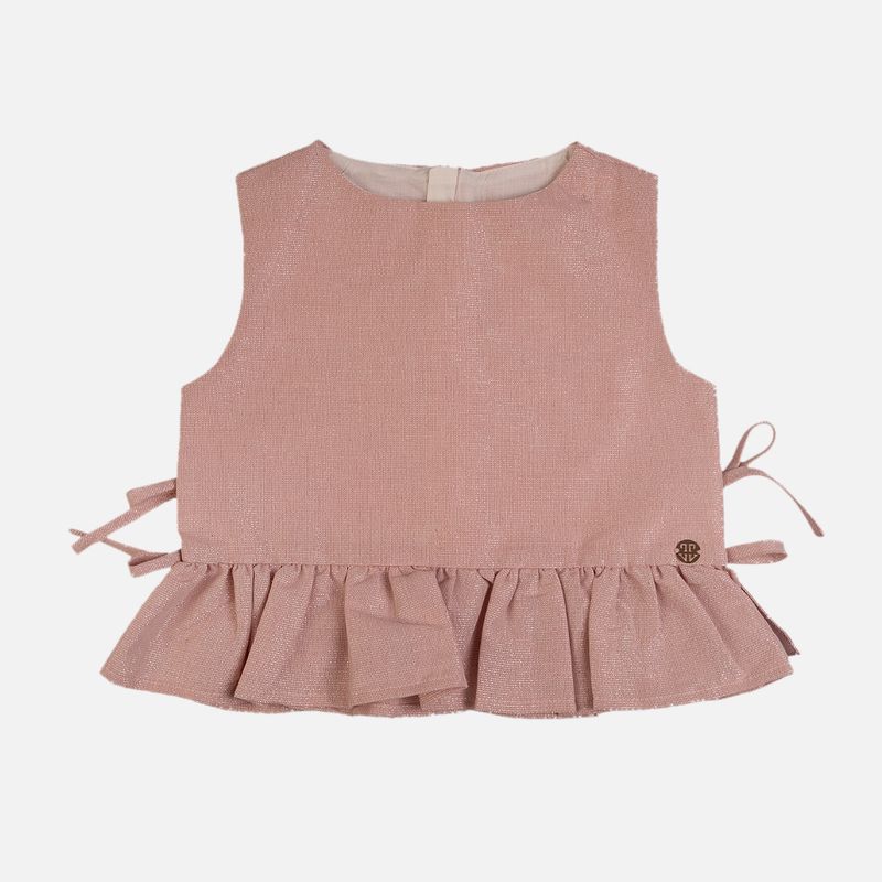 Conjunto Infantil Lurex com Laços Rosa é confeccionado em tecido com 51% algodão e 44% viscose, um material leve, macio e com toque confortável para a pele delicada da criança. Seu brilho sutil, proporcionado pelo efeito de lurex, adiciona elegância ao visual, enquanto os laços laterais e o babado na barra da blusa trazem um charme especial ao conjunto.