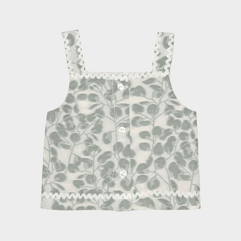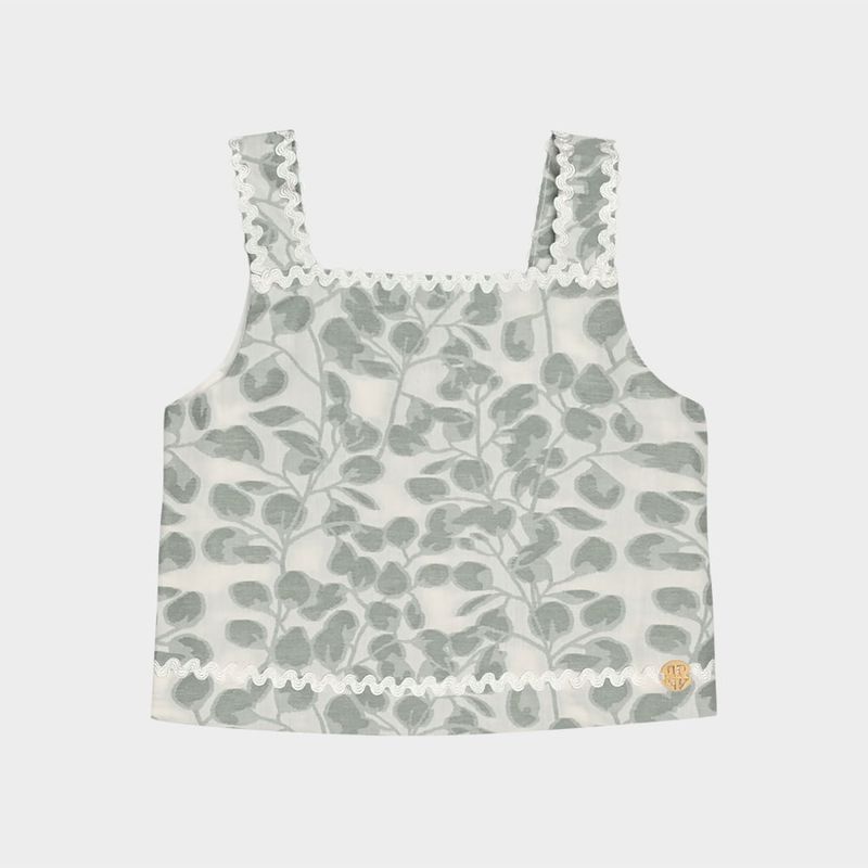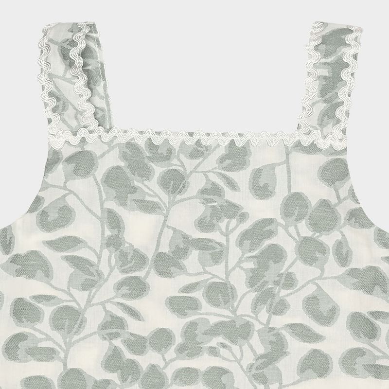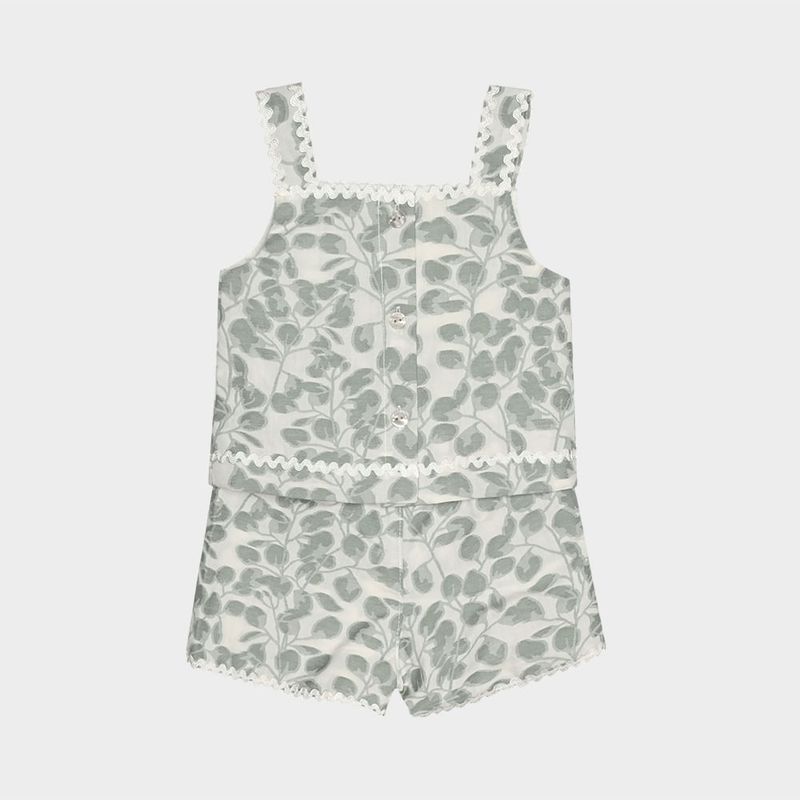 O conjunto traz delicadeza e sofisticação para os dias mais frescos e ensolarados. Desenvolvido em tecido leve e macio, apresenta uma estampa exclusiva de folhagens em tons suaves, com acabamento refinado em sianinha aplicada na barra, alcinhas e recortes, proporcionando um charme extra à peça.