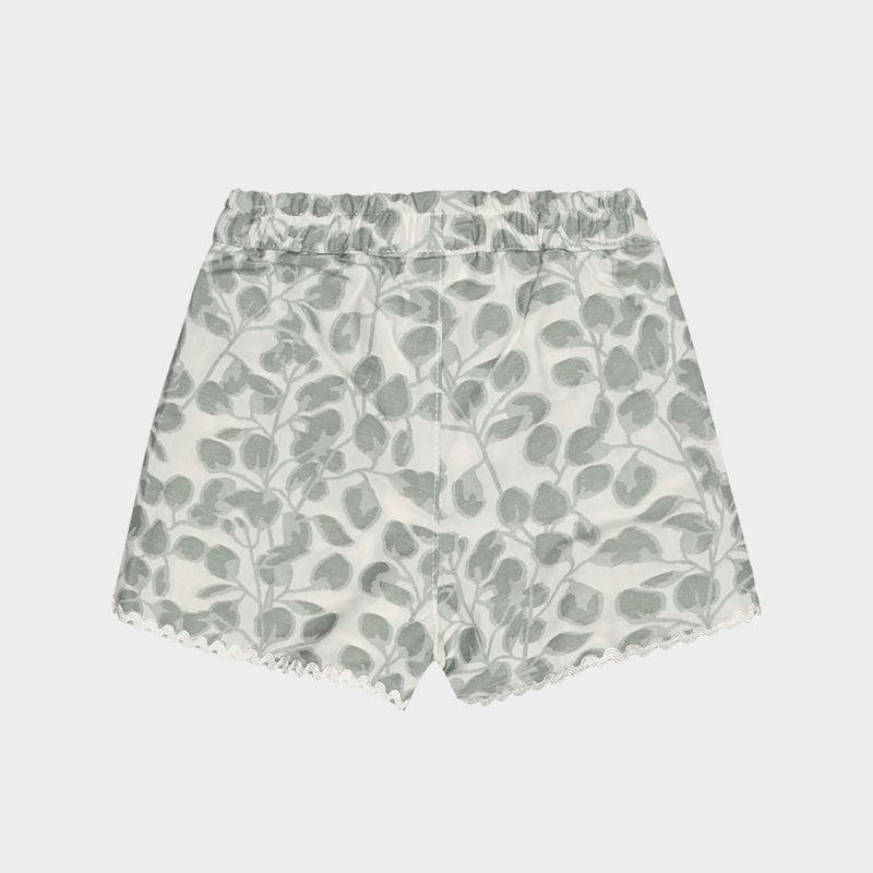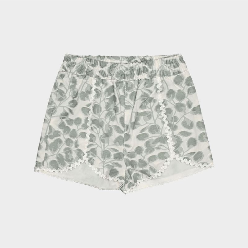 O short acompanha o mesmo padrão floral, com cintura de elástico e barrado delicadamente finalizado, oferecendo liberdade de movimentos e muito conforto.