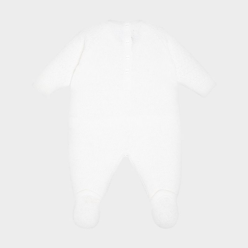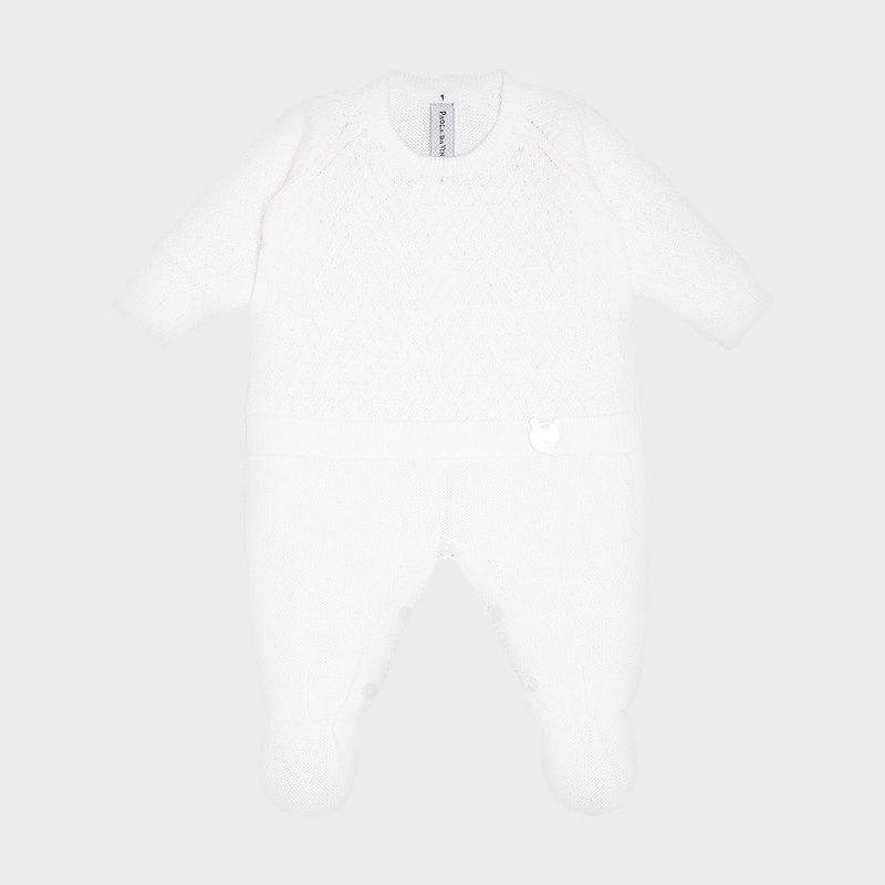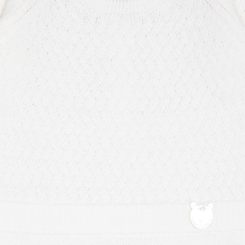Confeccionado em tricot com textura em ponto tijolinho, o macacão possui modelagem com efeito blusa falsa, gola redonda e botões nas costas e entrepernas para facilitar a troca.