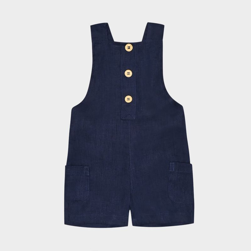 O modelo conta com alças cruzadas nas costas e botões frontais em madeira natural, que trazem um toque rústico-chique e facilitam o vestir. Os bolsos aplicados na parte frontal adicionam funcionalidade e charme ao design. Com elástico embutido na cintura traseira, garante ajuste perfeito e liberdade de movimento para os pequenos.