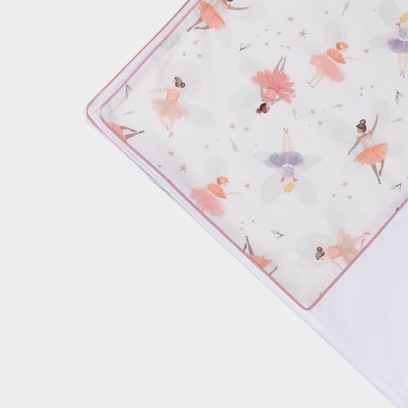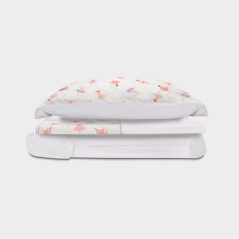 Com estampa delicada de bailarinas, o conjunto une leveza e sofisticação, trazendo charme ao enxoval infantil. O acabamento refinado valoriza cada detalhe, garantindo um visual elegante e atemporal para o quarto.