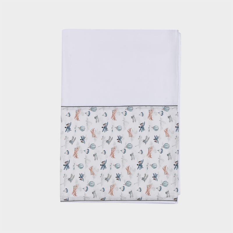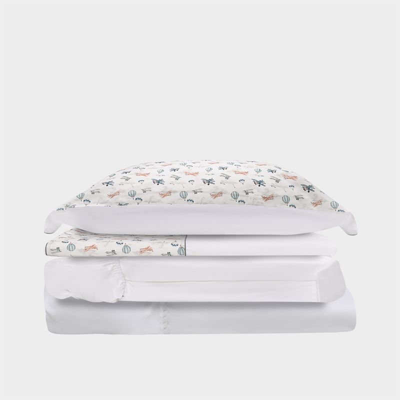 Com estampa delicada de balões, o conjunto une leveza e sofisticação, trazendo charme ao enxoval infantil. O acabamento refinado valoriza cada detalhe, garantindo um visual elegante e atemporal para o quarto.