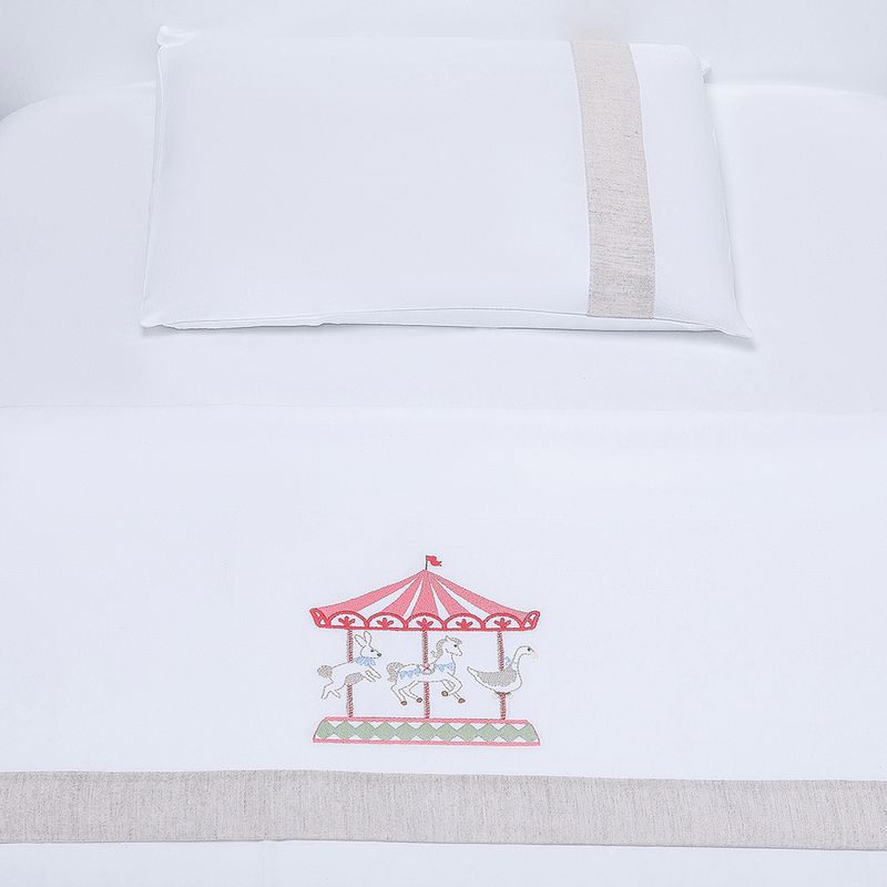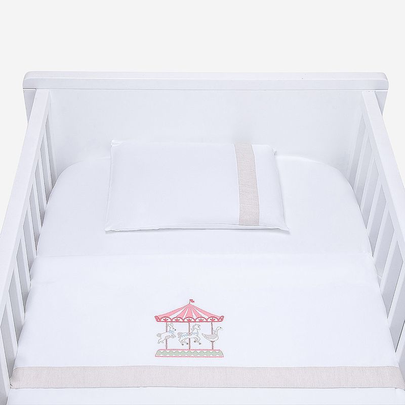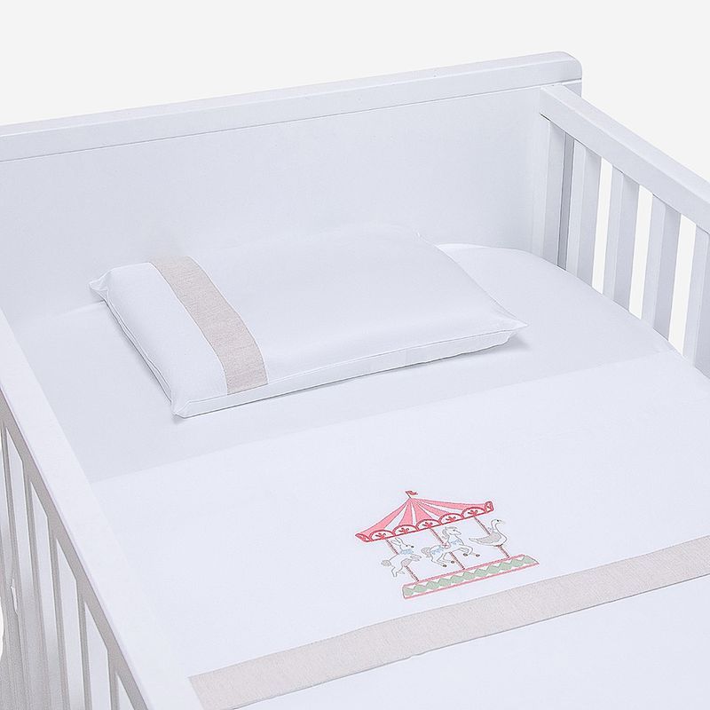 O Jogo de Berço em algodão egípcio 400 fios, trazendo o máximo de suavidade, frescor para o enxoval do bebê. O bordado delicado do carrossel, adiciona um toque lúdico e sofisticado, transformando o berço em um cenário encantador.