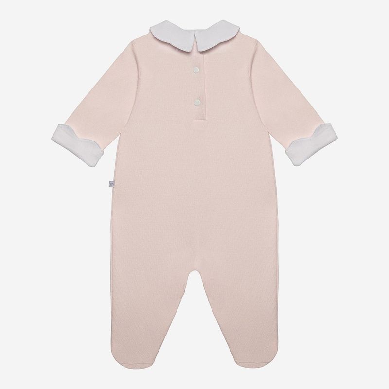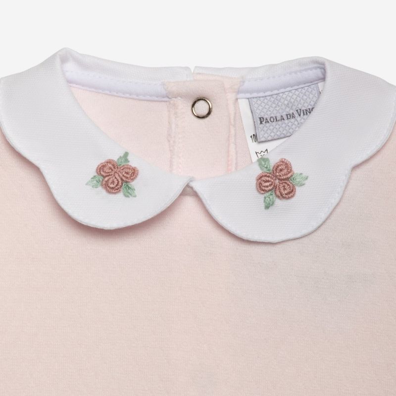 O destaque está na gola ondulada em piquê branco, adornada com bordados manuais de pequenas flores em tons de rosa e verde, que trazem o charme artesanal. As mangas longas com punhos virados e o abotoamento nas costas e entrepernas garantem praticidade no vestir e nas trocas do dia a dia.