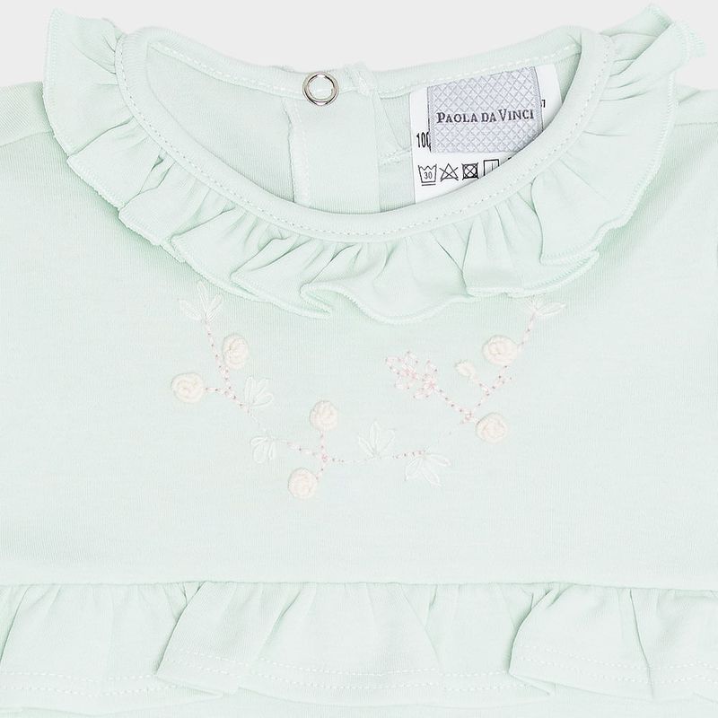 O modelo apresenta gola redonda com babado duplo, aplicação de bordado floral em tom suave na parte frontal e detalhe franzido logo abaixo do peito, criando um caimento gracioso.