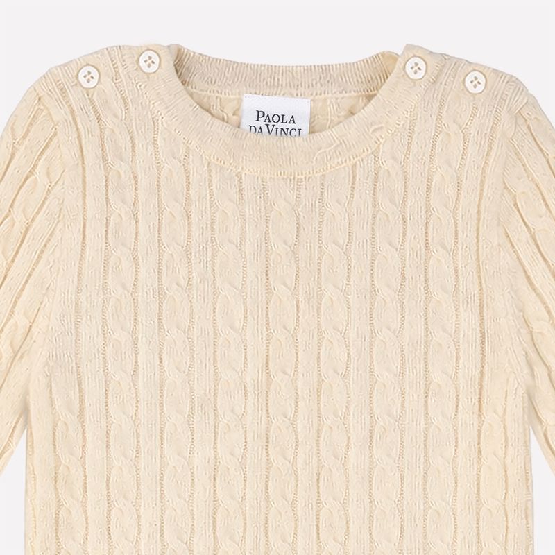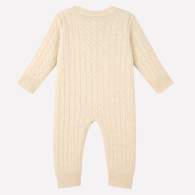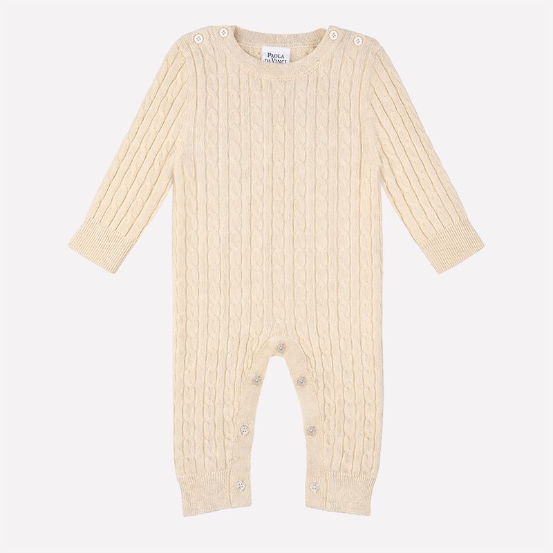 Macacão bebê em tricô 100% cashmere, uma peça sofisticada que oferece toque extremamente macio e conforto térmico natural para os dias mais frescos. O cashmere puro é leve, delicado e aquece na medida certa sem pesar, sendo ideal para a pele sensível do bebê. O clássico tricô com tranças valoriza o acabamento refinado e traz elegância atemporal à peça.