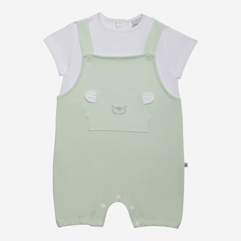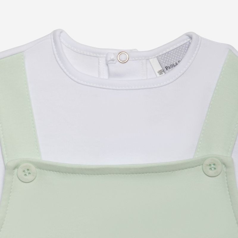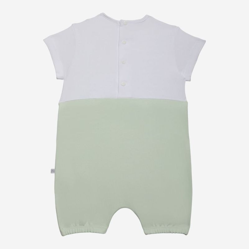 O macacão curto traduz o conforto e a doçura do universo bebê com a delicadeza. Confeccionado em malha de algodão egípcio, o modelo oferece toque extremamente macio, ideal para a pele sensível dos pequenos. A parte superior branca contrasta com o tom verde suave do macacão, criando um visual leve e encantador.