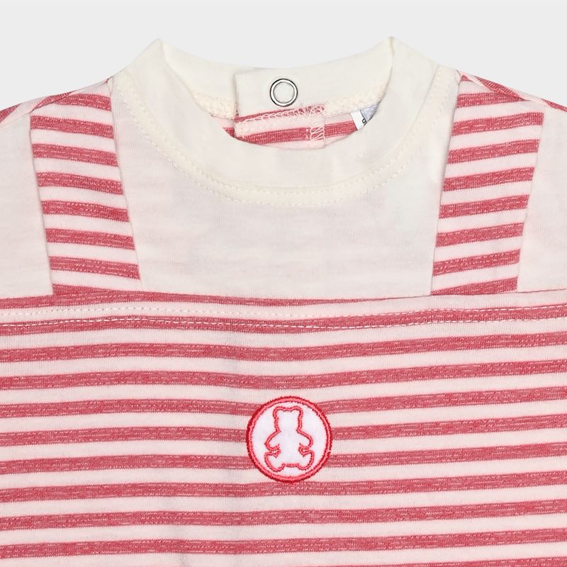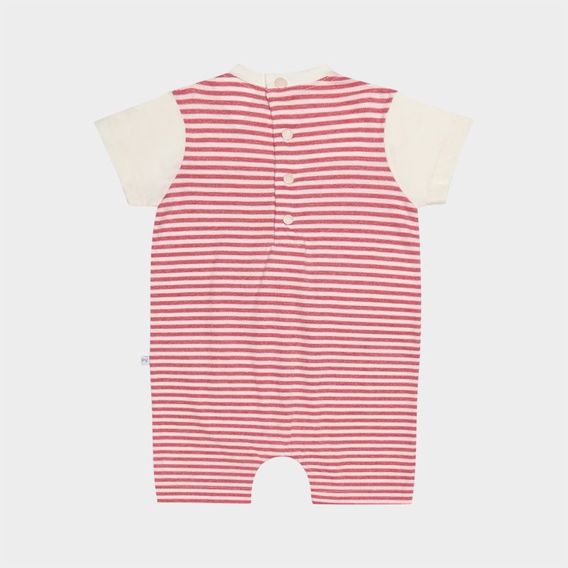 A peça se destaca pelas listras em tom vermelho suave, que conferem um toque alegre e elegante. A camiseta off white integrada possui gola redonda e mangas curtas, criando um contraste delicado com o corpo listrado. Possui abertura entrepernas com botões de pressão e fechamento nas costas, facilitando o vestir e a troca do bebê.