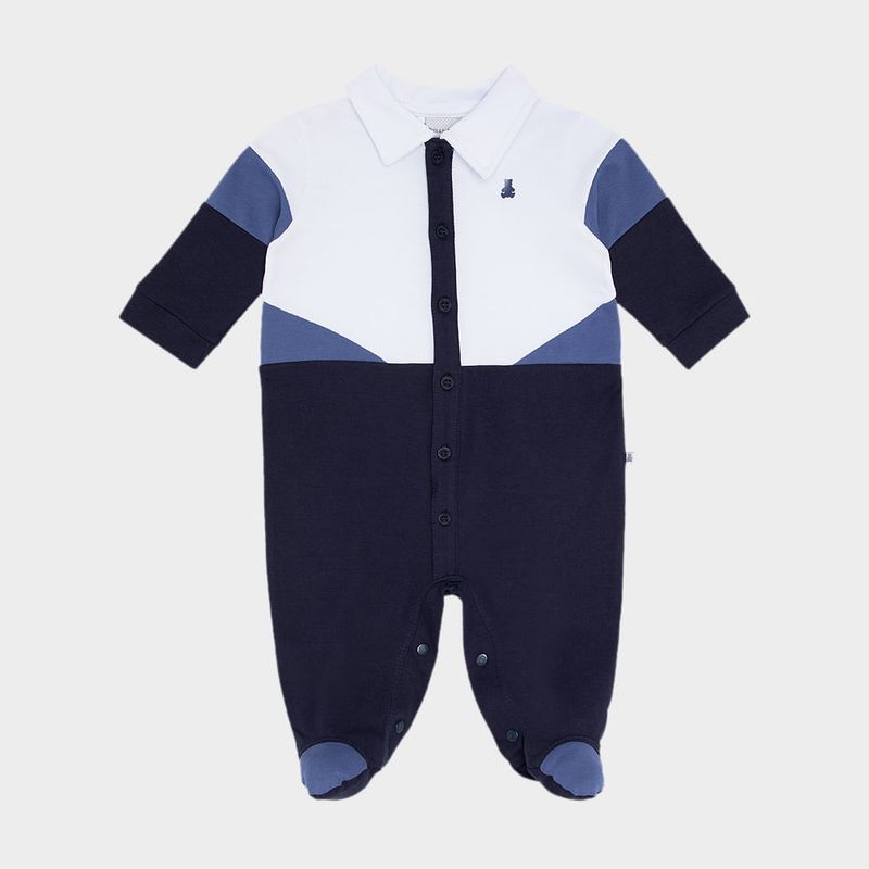 A peça traz design moderno com recortes geométricos em três tons de azul, gola polo estruturada e charmoso bordado de ursinho no peito. Os botões frontais e o fechamento por pressão entre as pernas garantem praticidade na hora de vestir e trocar o bebê.