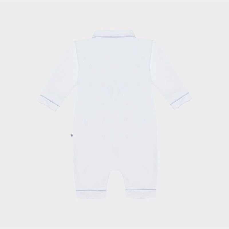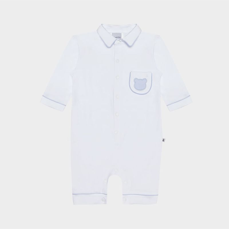O modelo apresenta gola camisaria com friso contrastante, um detalhe refinado que valoriza o design limpo e sofisticado. Possui bolsinho frontal com aplique do icônico ursinho, além de abertura frontal com botões de pressão e entrepernas para facilitar a troca. As mangas longas e o acabamento delicado nos punhos e barra completam o visual com suavidade e equilíbrio.