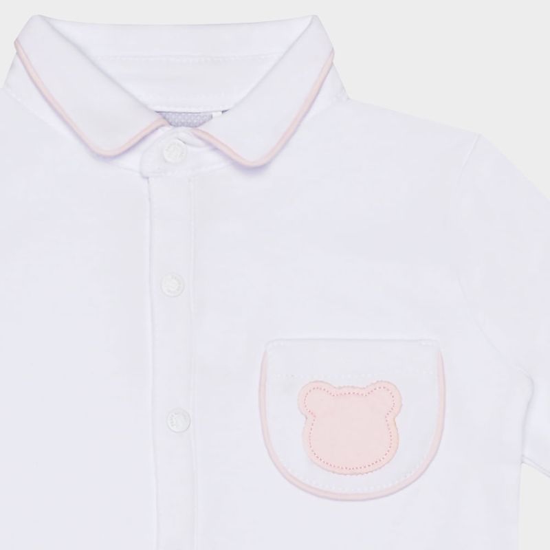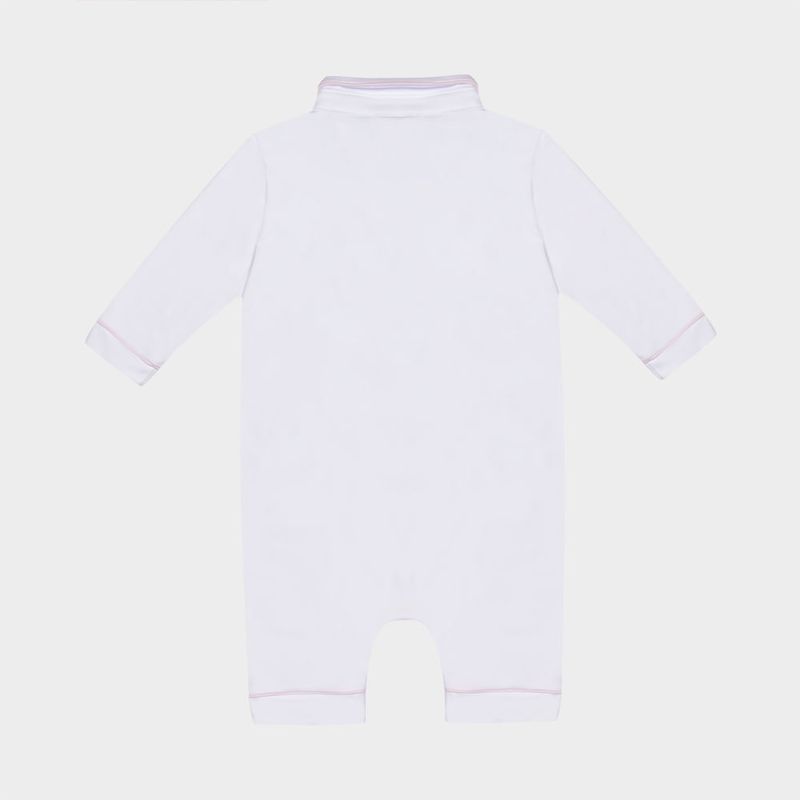 O modelo apresenta gola camisaria com friso contrastante, um detalhe refinado que valoriza o design limpo e sofisticado. Possui bolsinho frontal com aplique do icônico ursinho, além de abertura frontal com botões de pressão e entrepernas para facilitar a troca. As mangas longas e o acabamento delicado nos punhos e barra completam o visual com suavidade e equilíbrio.