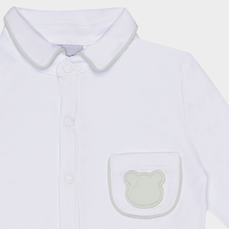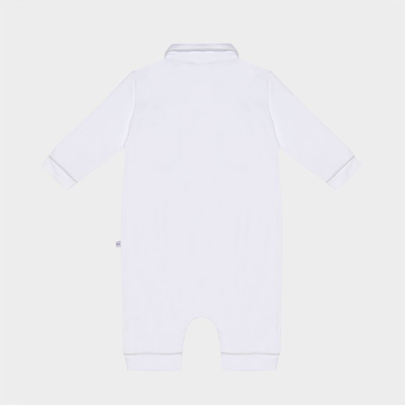 O modelo apresenta gola camisaria com friso contrastante, um detalhe refinado que valoriza o design limpo e sofisticado. Possui bolsinho frontal com aplique do icônico ursinho, além de abertura frontal com botões de pressão e entrepernas para facilitar a troca. As mangas longas e o acabamento delicado nos punhos e barra completam o visual com suavidade e equilíbrio.
