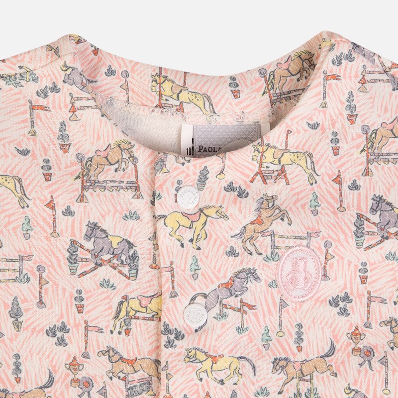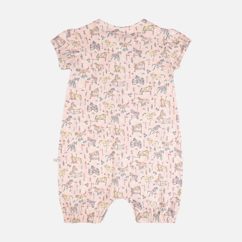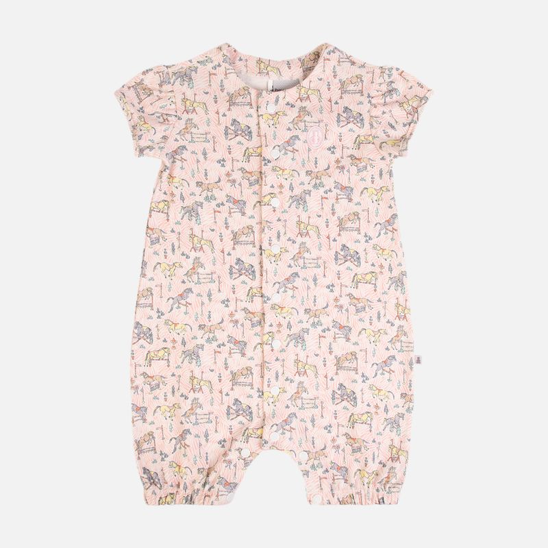Macacão Curto Bebê em tecido egípcio oferece suavidade, frescor e muito aconchego para a pele delicada dos pequenos. Confeccionado em algodão macio, o modelo traz a charmosa estampa Liberty de cavalos em tons suaves, criando um visual lúdico e delicado.
