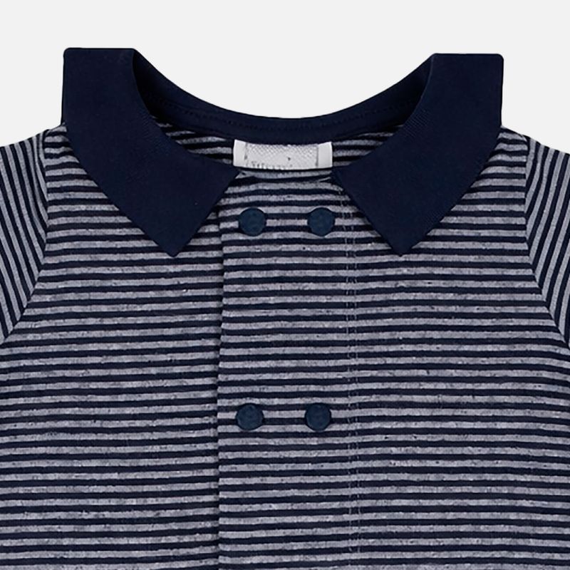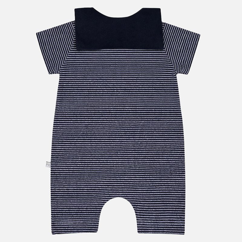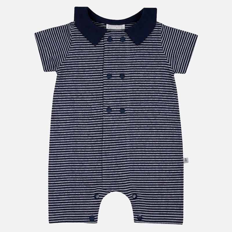 Macacão curto em malha listrada azul marinho, confeccionado em malha macia e confortável, ideal para proporcionar leveza e liberdade de movimento.