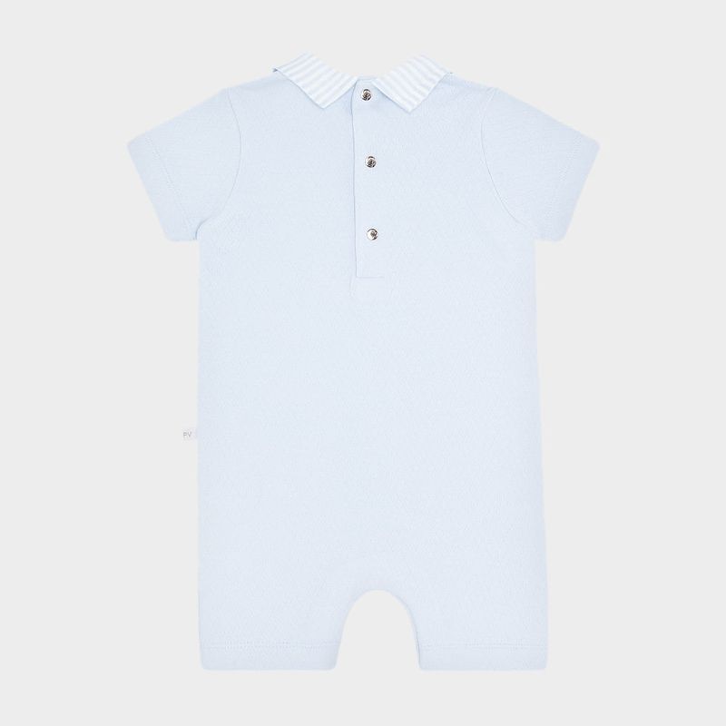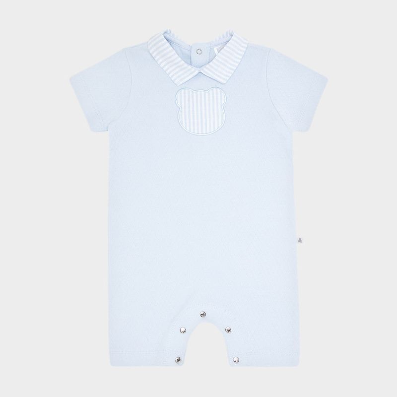 O modelo apresenta gola clássica em tecido listrado no mesmo tom do macacão, harmonizando com o delicado bordado em formato de ursinho aplicado na parte frontal. Possui mangas curtas, botões de pressão entrepernas para facilitar as trocas e abertura traseira com botões funcionais, garantindo praticidade no vestir.