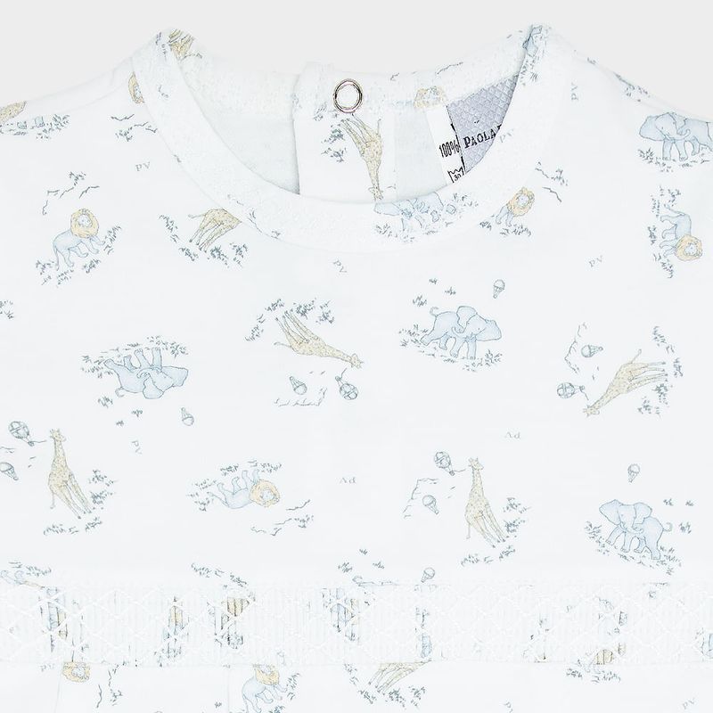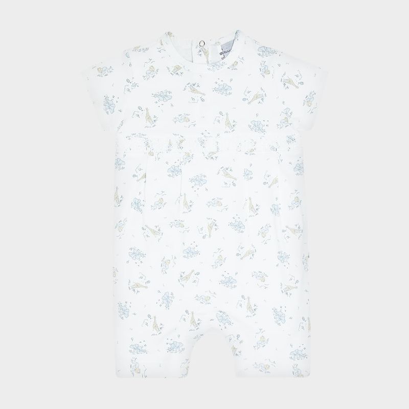 A peça traz estampa exclusiva com temática de safari em tons suaves, que adiciona charme ao visual do bebê. O detalhe em ponto smock na pala valoriza o acabamento artesanal, enquanto as mangas curtas garantem frescor nos dias mais quentes. Conta com abertura nas costas e entrepernas por botões de pressão, proporcionando praticidade no vestir e nas trocas.